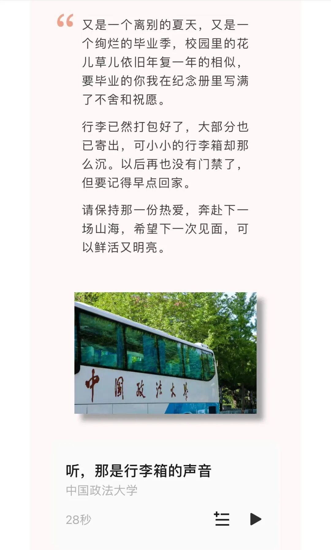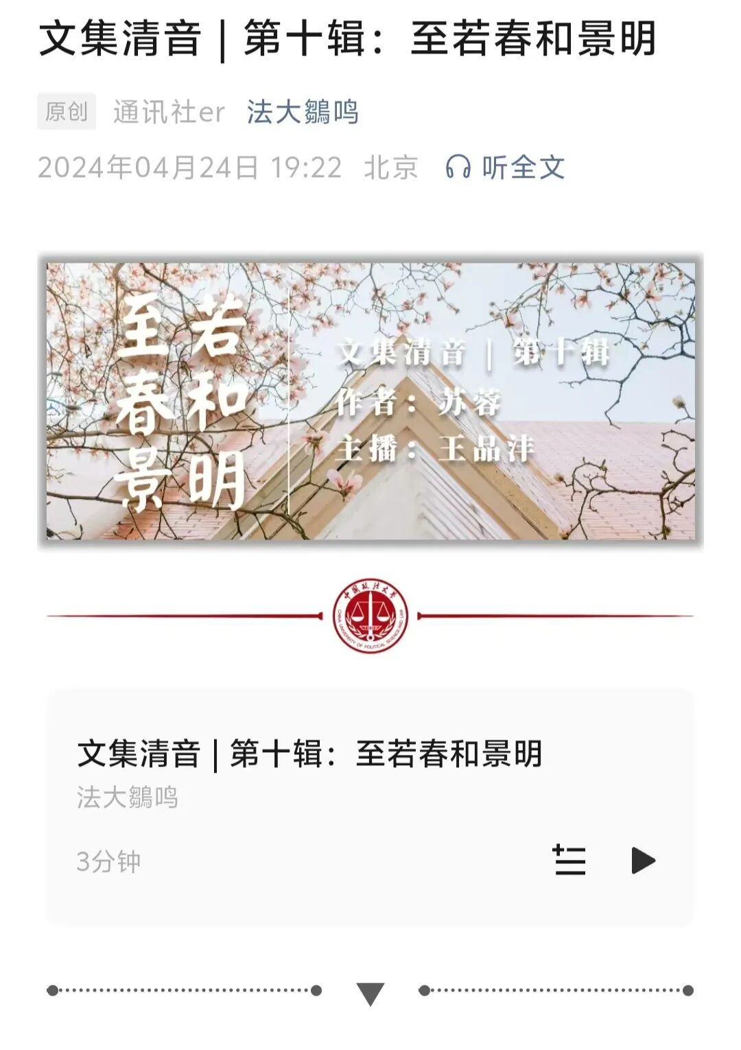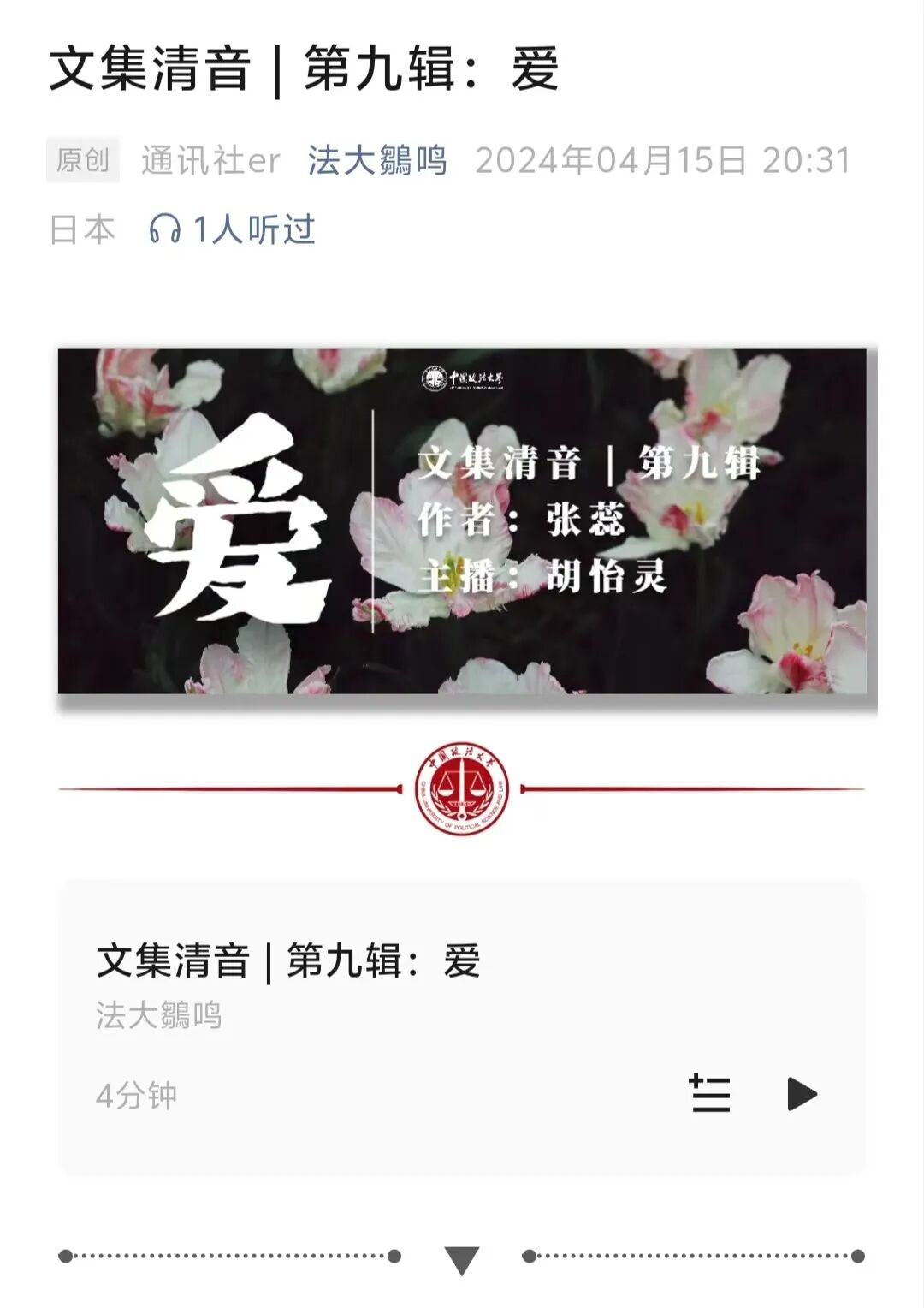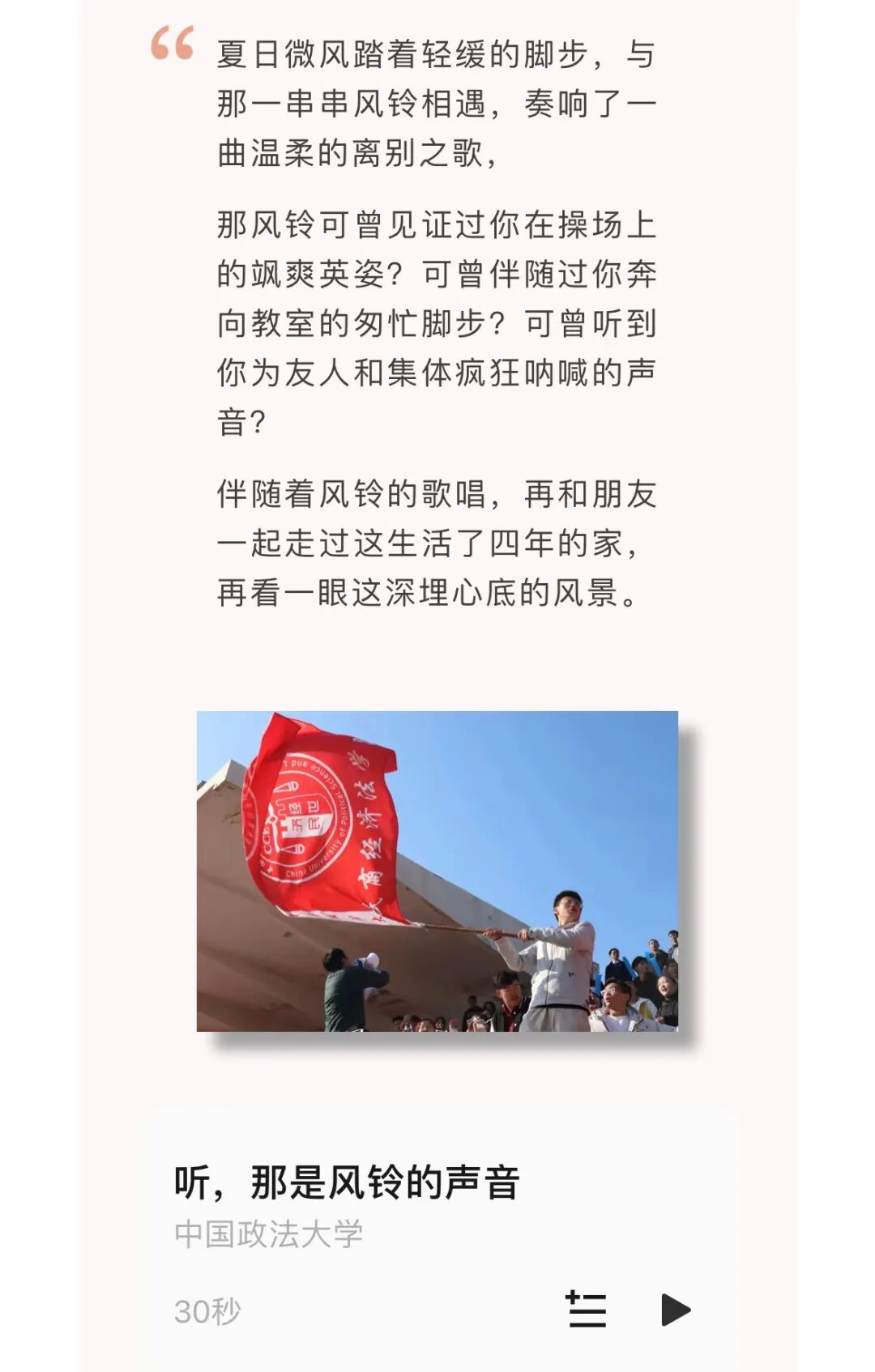 我们的声音,不仅在校园的每个角落回响,更通过荔枝FM、微信公众号等网络平台,将法大的声音传递到更远的地方。从主楼b301的小小一隅出发,我们的声音像春日的小花,悄悄地绽放,静静地传播,遍布校园的每一个角落。每一期节目,都是一次寻找浪漫的旅程,我们在岁月的长河中,遇见那些珍贵的宝藏,分享那些珍藏的故事,收获那些共鸣的情感。