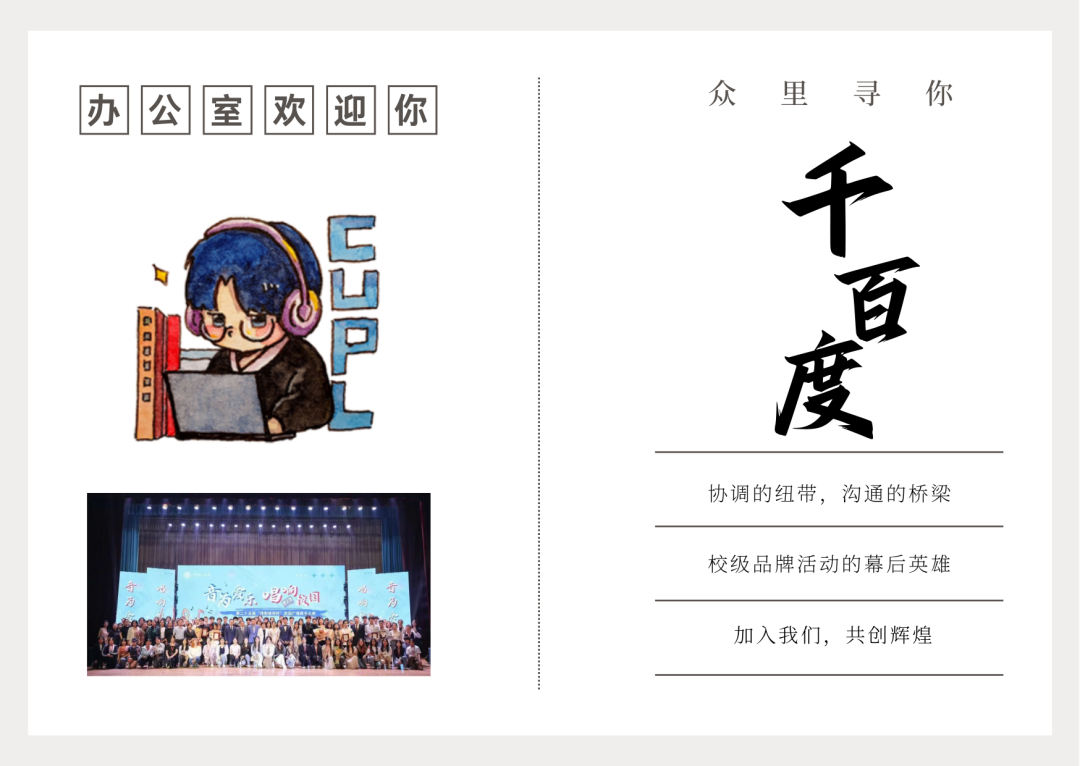 新媒体中心欢迎任何志同道合的伙伴,这里将因你的到来而更加精彩,而你,将成为这精彩故事的一部分。我们在这里,期待着与你一起,用新媒体的力量,让法大的故事传遍每一个角落。