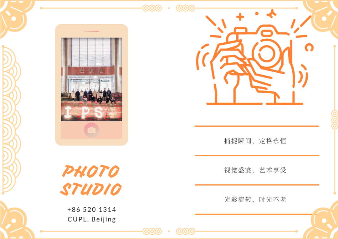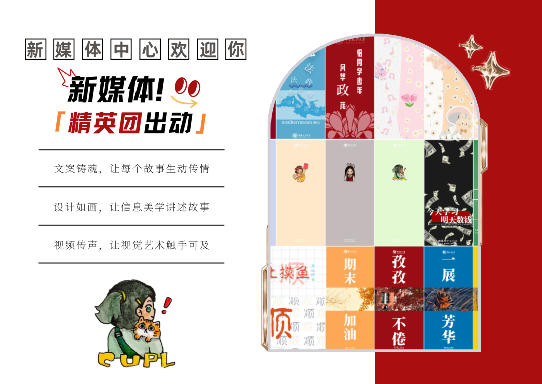 你能够学习到如何制作出一篇篇精美的推送,设计一幅幅精致的文创产品,用美的视角展现你眼中的法大和你心中的世界。