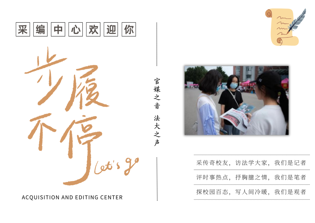 “记天下事,为先行者”。来到这里,你将作为一名记者,穿梭在校园的每一个角落,采传奇校友的故事,访法学大家的智慧。你不仅是一个记录者,更是一个讲述者,你的文字将承载着法大的声音,传遍每一个角落。