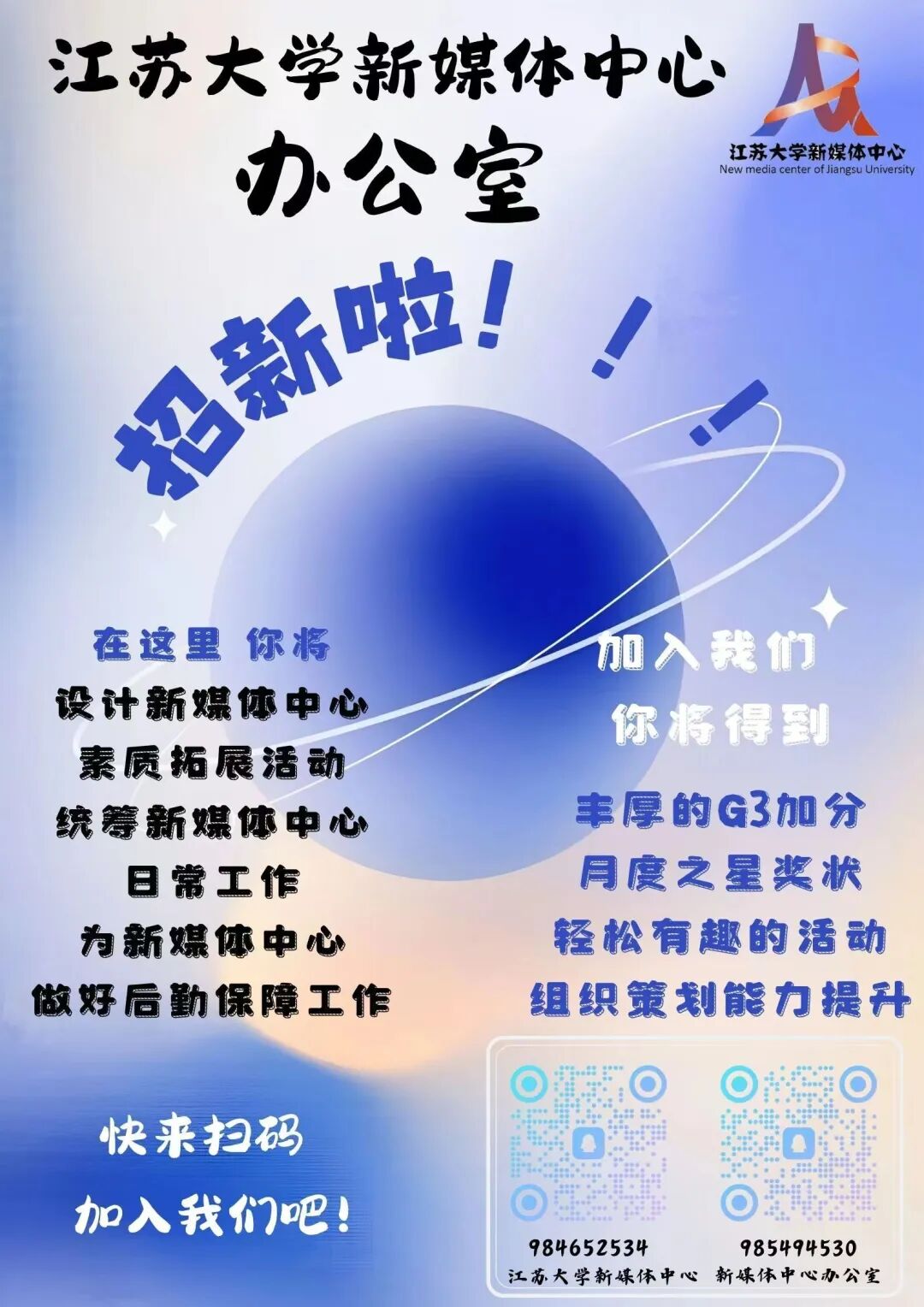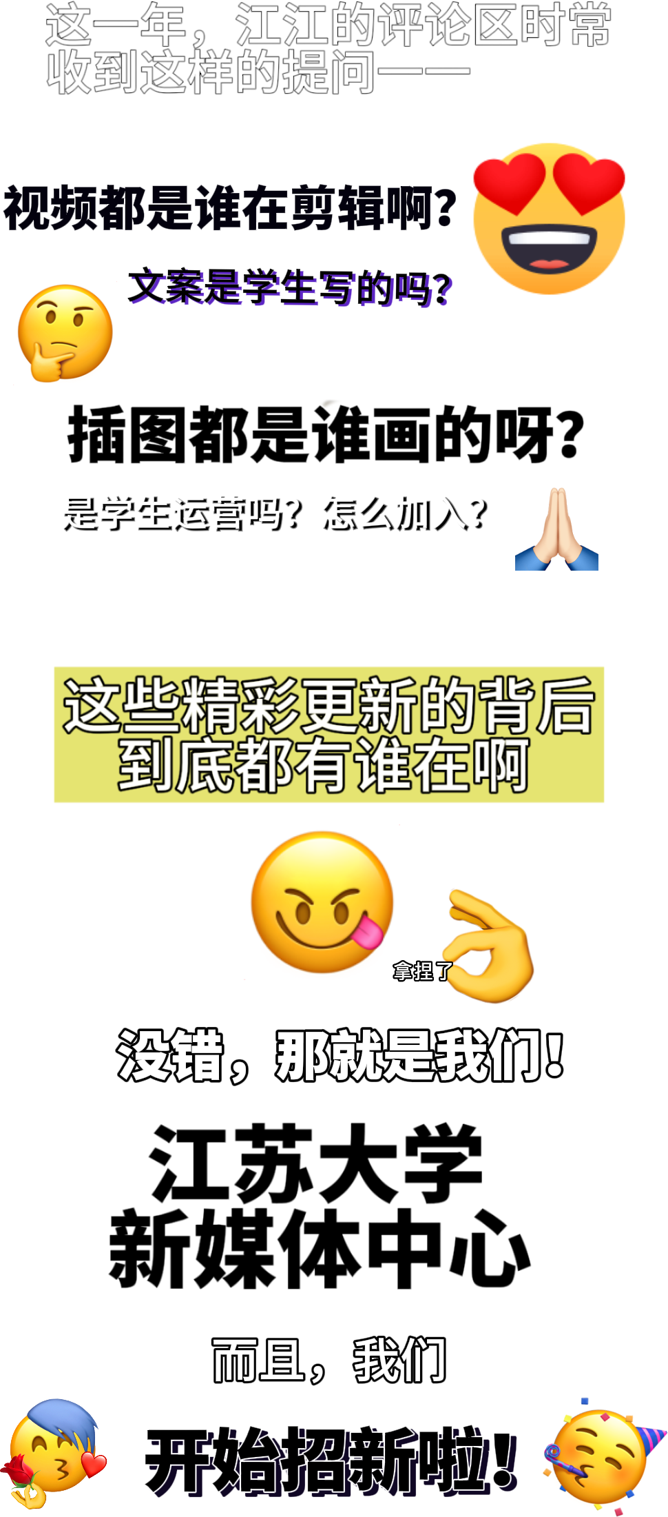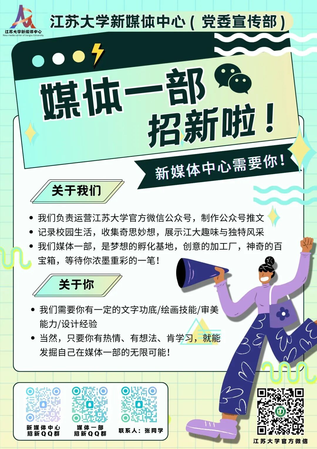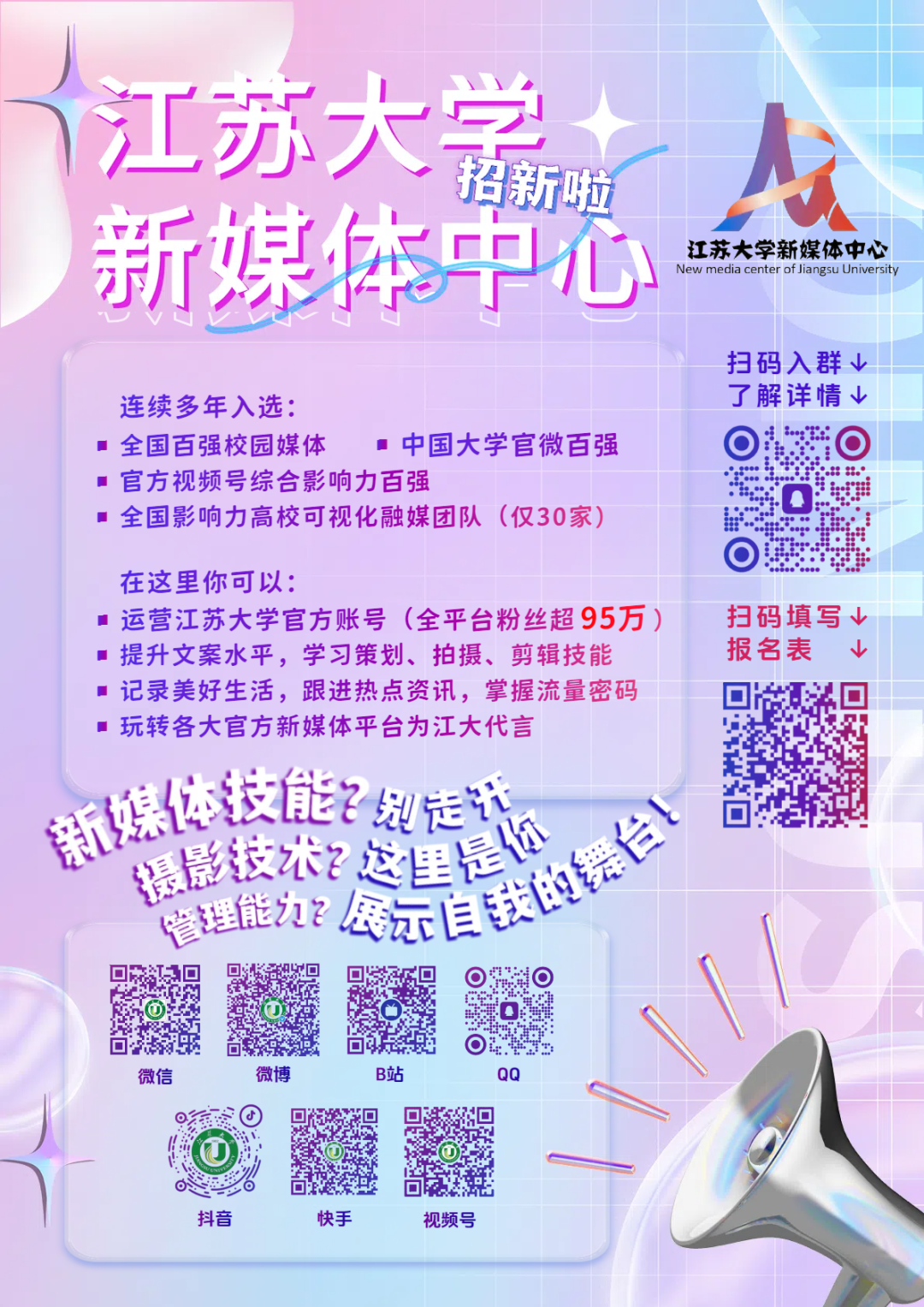 即日起,扫描上方二维码,加入江苏大学新媒体中心招新QQ群,可线上咨询相关问题。近期我们也将在校园内设置线下报名点,接受现场咨询和报名。