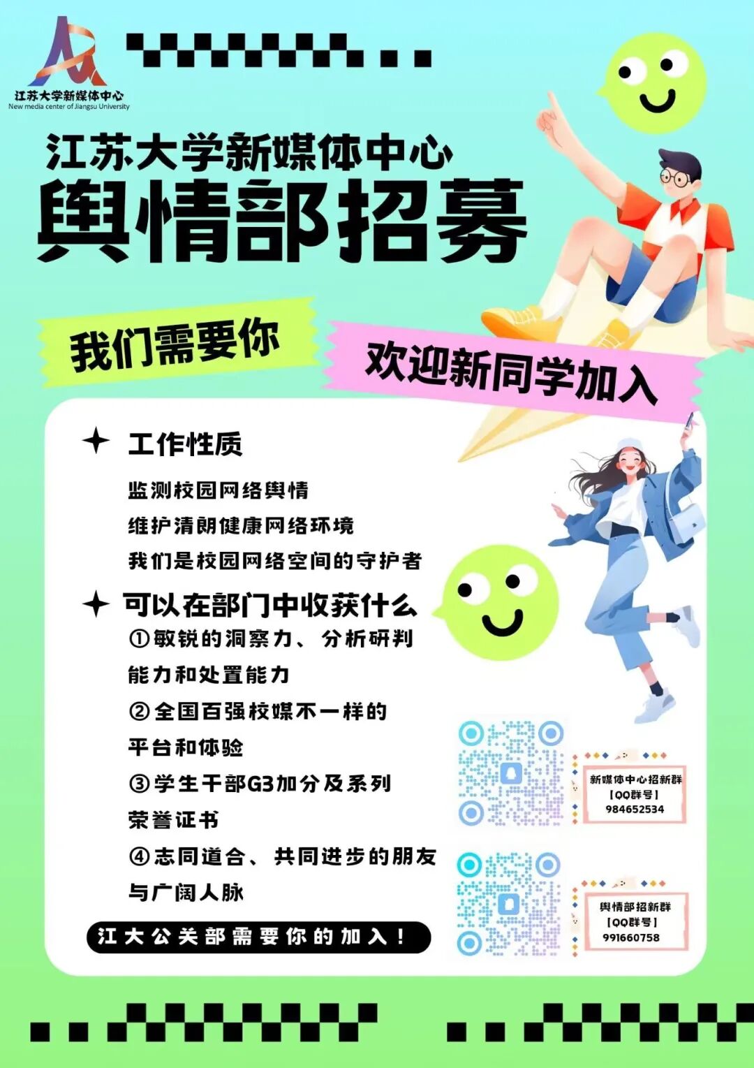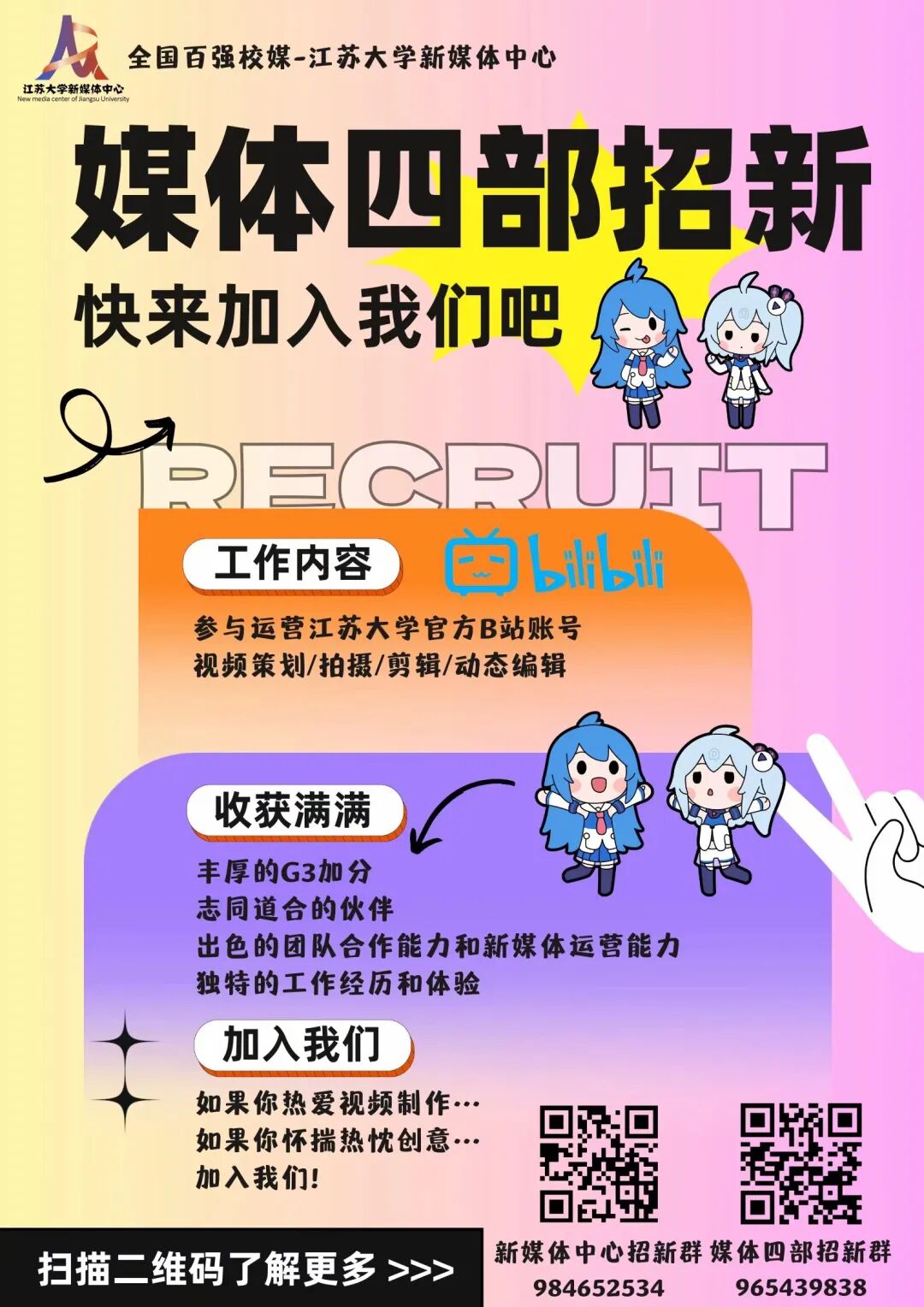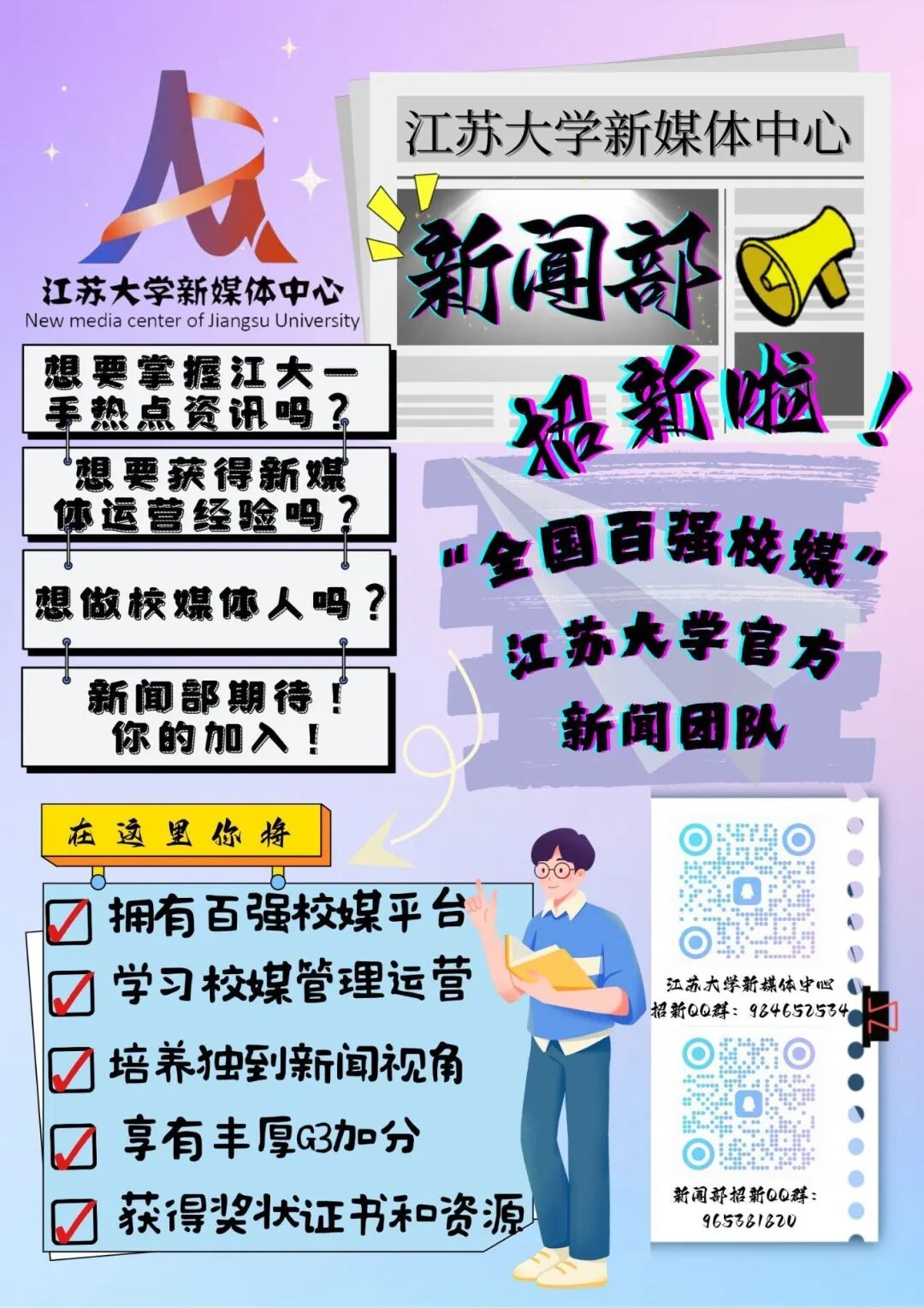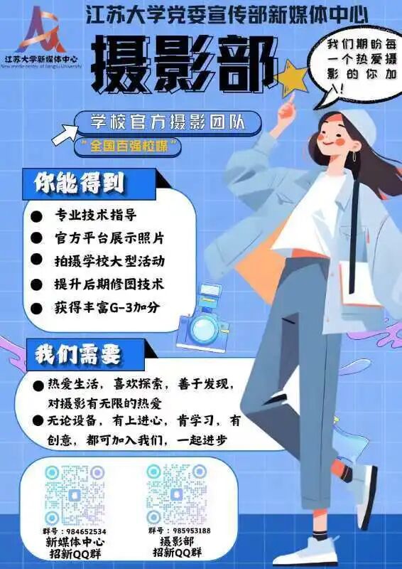 即日起,扫描上方二维码,加入江苏大学新媒体中心招新QQ群,可线上咨询相关问题。近期我们也将在校园内设置线下报名点,接受现场咨询和报名。
