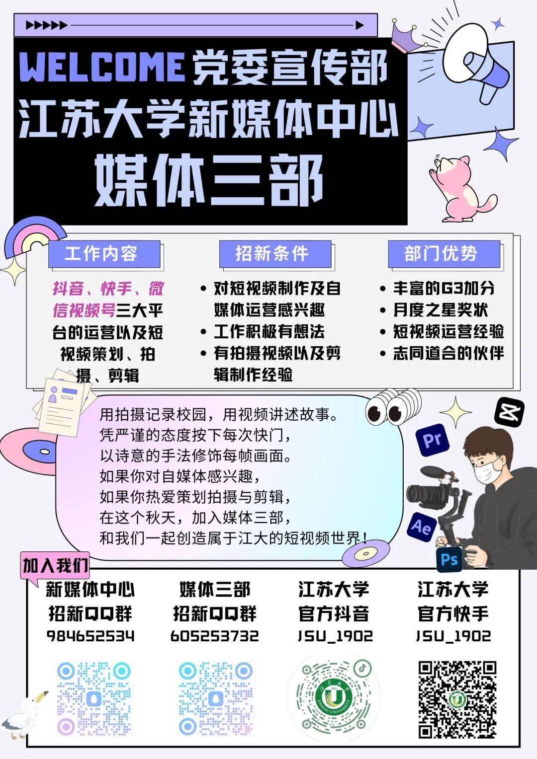 媒体三部负责运营江苏大学官方抖音、官方快手、官方视频号,工作内容包括短视频的策划、拍摄、剪辑与发布等。