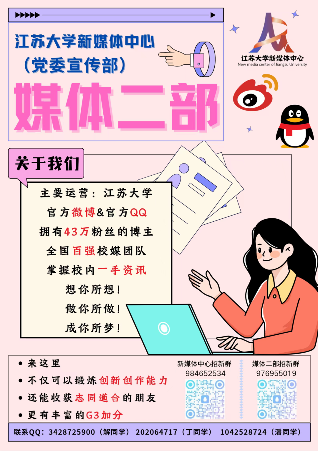 媒体二部负责运营江苏大学官方微博、官方QQ校园号,以及相关的线上线下活动开展。