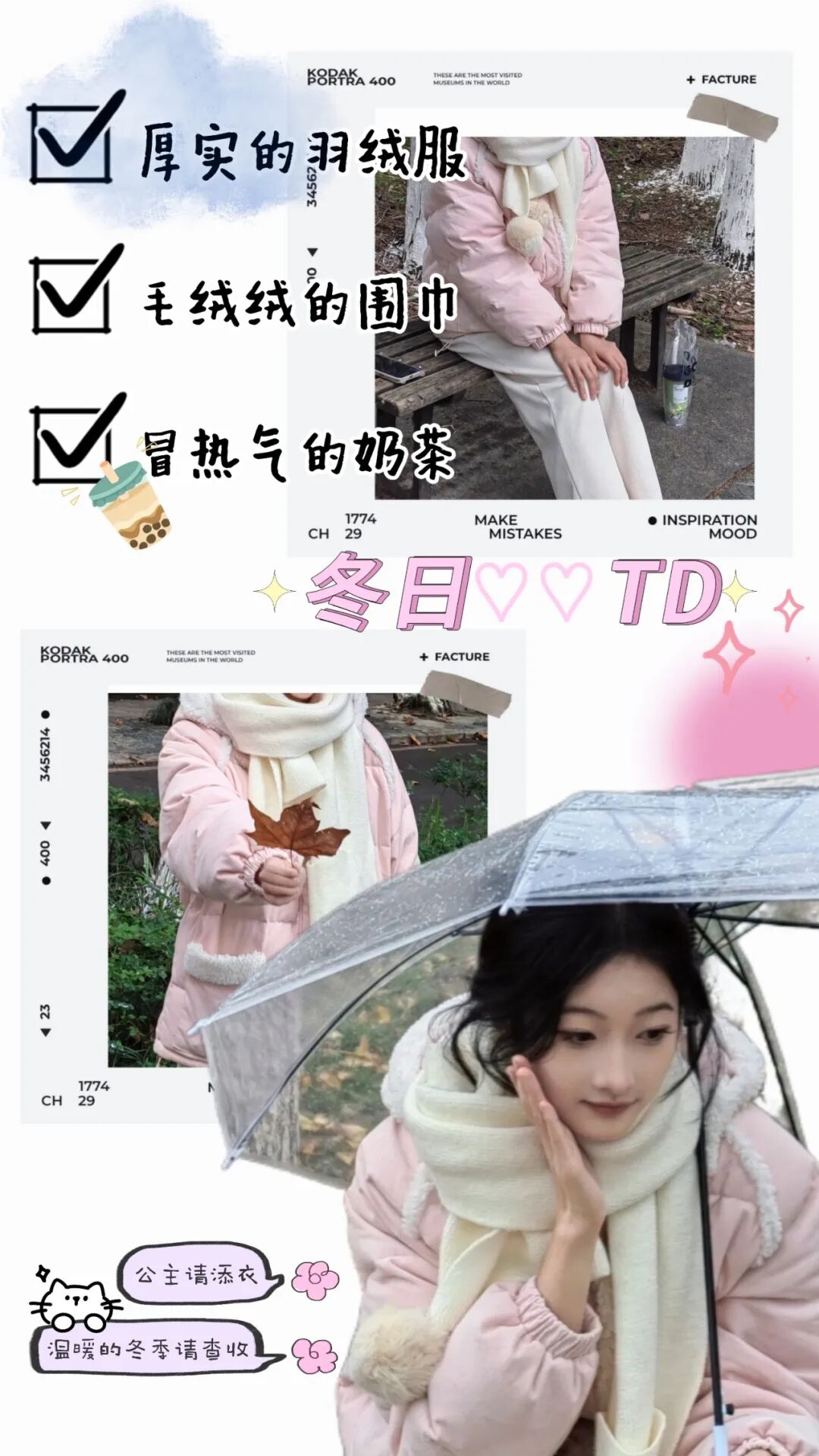一袭粉色羽绒服搭配白色围巾