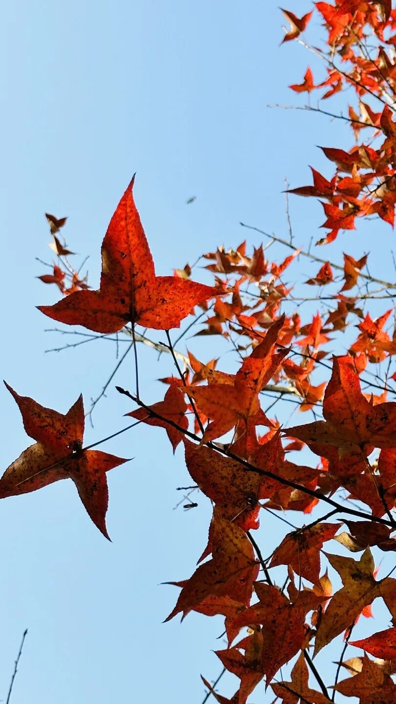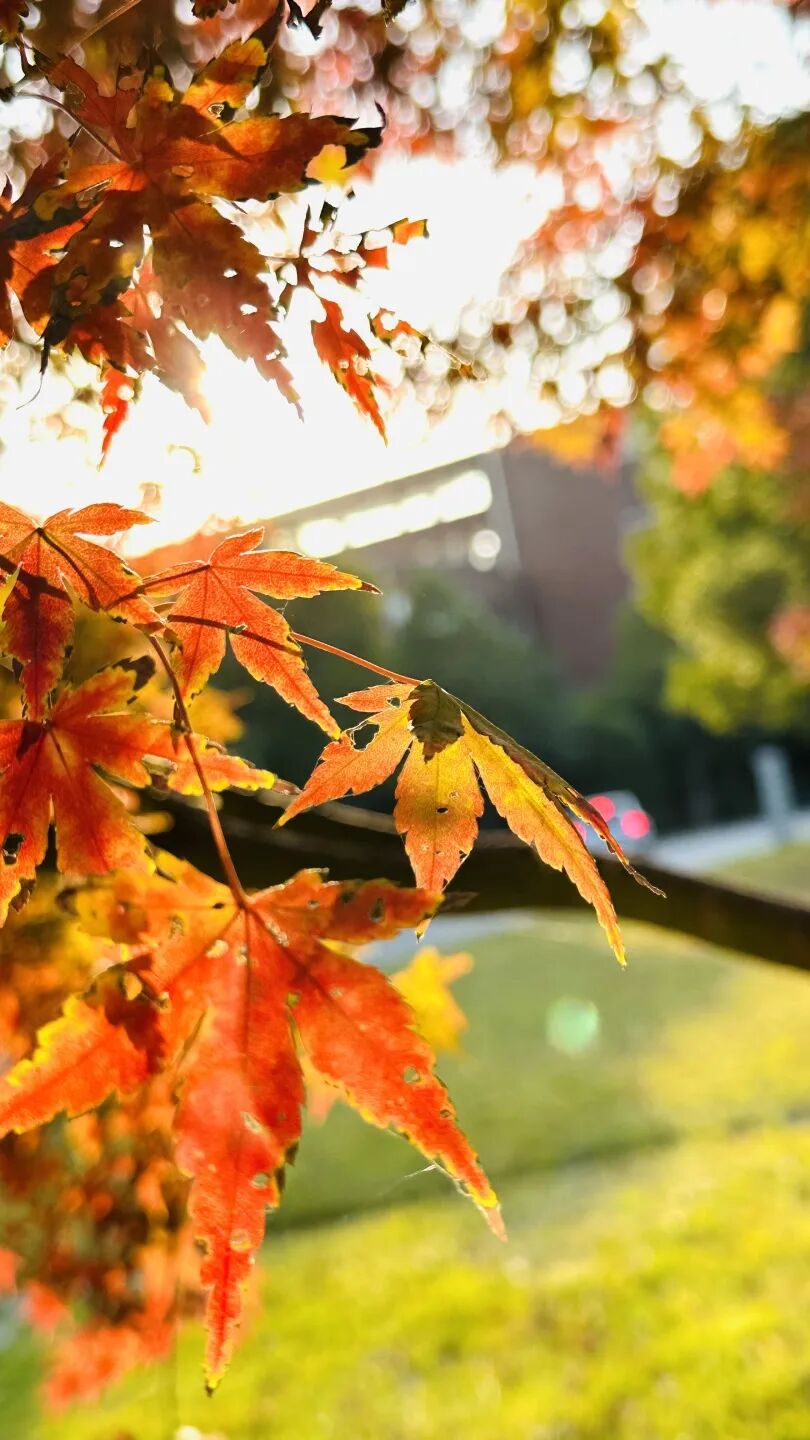 落叶悠悠舞金阶,晨光斑驳照枫林