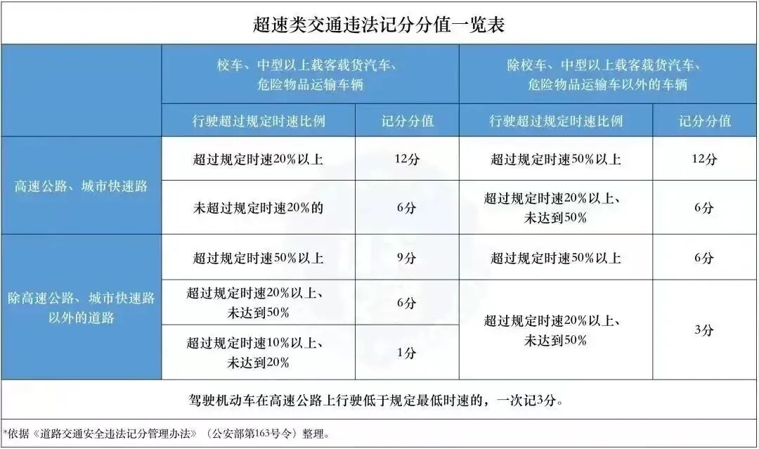 在我国现行记分规定中,根据超速的严重程度,扣分梯度分成了5个梯度,还对高速公路和普通道路的超速处罚标准进行了区分: