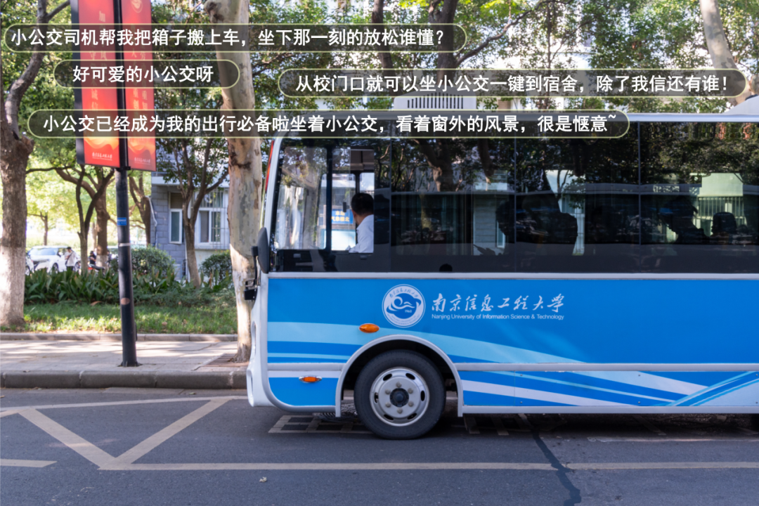“踏出地铁站,就能直达学校大门;全覆盖的共享电动车、自行车,让我们在校园里穿梭自如……小公交的每一次到站,都在为求学之路温馨护航。便捷的交通,让拖着行囊返校后的信大学子,一键直达宿舍。”
