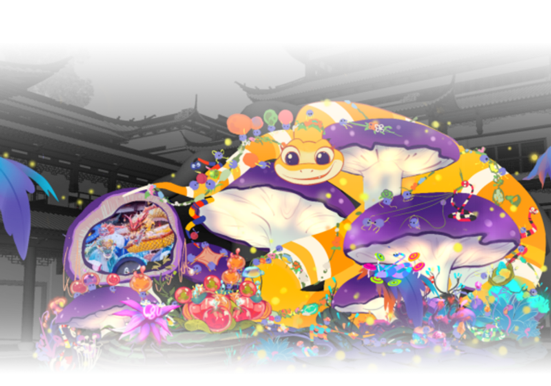 中心广场化身松弛感满满的丛林,呈现“天地人和,金蛇献瑞”的热闹景象,灵蛇、蘑菇、小菌人,形成了一幅不同以往的自然愉悦之景。