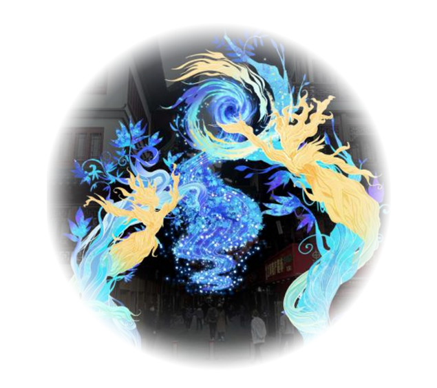 在黄金广场的丛林中心,以《山海经》建木神树为原型打造了一颗千年古树花灯。它是整个丛林生机与繁茂的记录者,亦是生命的承载。古树枝叶繁茂,小型花草、青苔、山海的灵兽,都惬意地栖息在古树上,呈现出一幅和谐美好的生态景象。