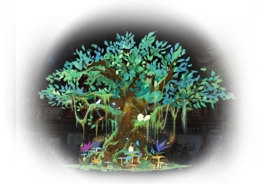 五号门,创世神迹,兴旺之门,以女娲与伏羲的神话故事为灵感,展现创世后化为两棵神力古树的庄严场景。藤蔓交织成高大的树干,其枝叶向四面八方伸展,生命源泉庇护万物,象征天地间的灵韵与创世之力。视觉上仿佛一条流动的银河,滋养丛林,呈现出生机盎然的秘境之美。