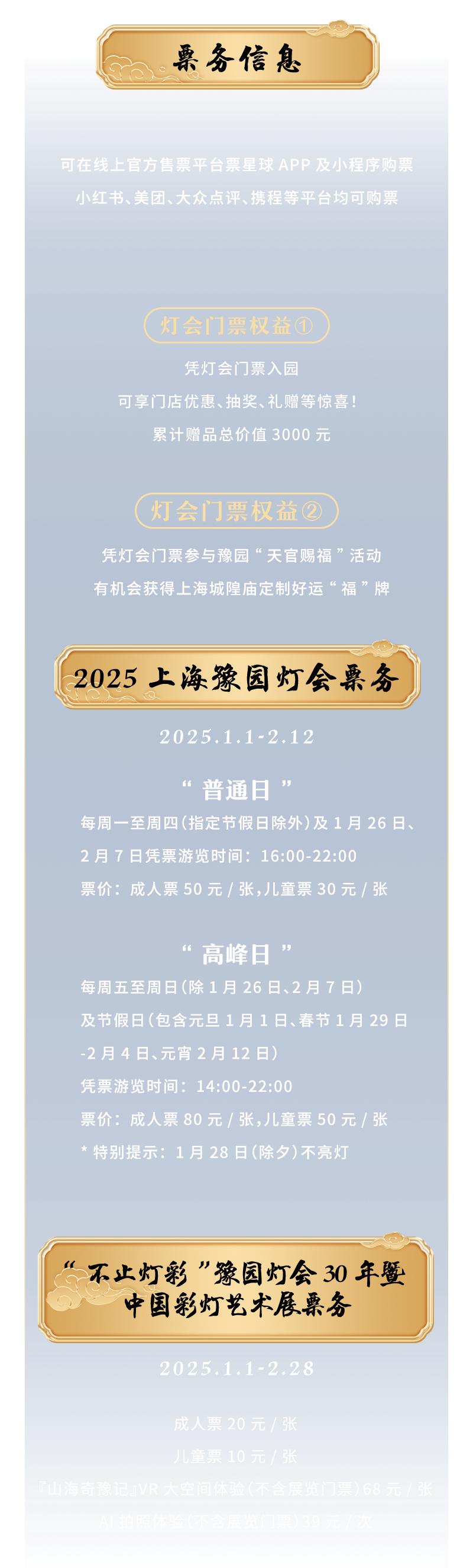 2025年1月1日至2月12日,为期42天的豫园灯会将为大家带来美好的新年仪式感!从2号门进入,依次经过黄金广场、凝晖路、中心广场、九曲桥、豫园老街五大主题体验区域,由1号门出,全面欣赏灯彩之美。还可经方浜中路步行500米,到BFC外滩金融中心枫泾路欣赏同款“庄周梦蝶”灯组,现已亮灯!速速码住这份灯会观览地图,和家人朋友一起来打卡吧!