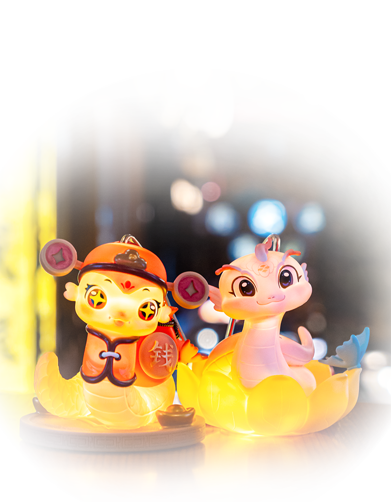 【灵蛇彩莲提灯】以“彩逐灵蛇转,形随舞凤来”为设计灵感,灵动小蛇置于莲花底座之上,寓意好运吉祥,打造庄周梦蝶的梦幻意境;【灵蛇财宝提灯】以“灵蛇纳福瑞,财运转乾坤”为设计灵感,采用财神+钱币+蛇宝宝的造型,打造祥瑞之蛇,喜气值满分。