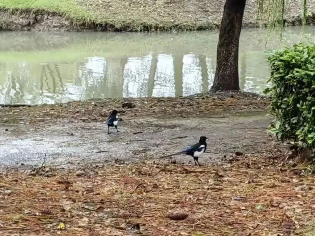 雨后的下午,我在一条河流旁瞥见了亭亭玉立的鹊学姐,她们的衣服很精致很漂亮。出于礼貌,我并没有去打扰她们,我只是在一旁静静地看着… 雨天、河流、柳树、松柏、清新的空气、不期而遇的鹊学姐,这一刻,我是幸福的。