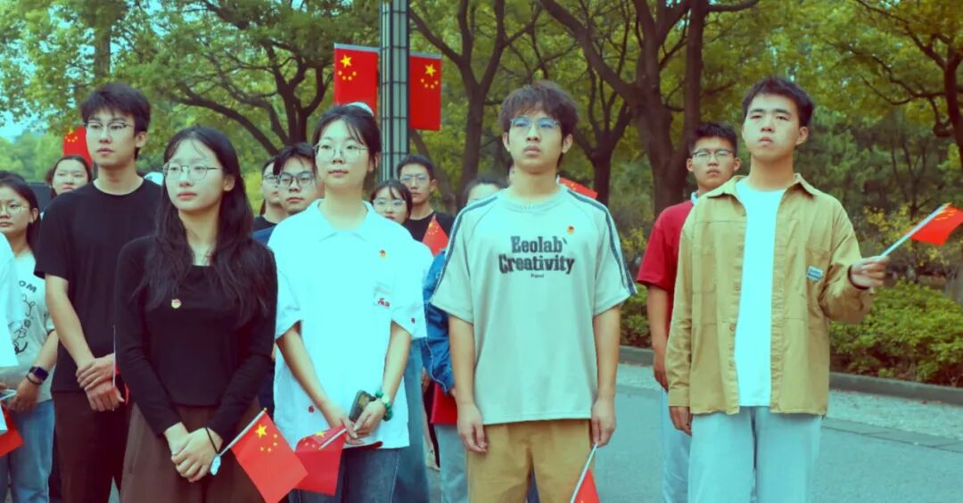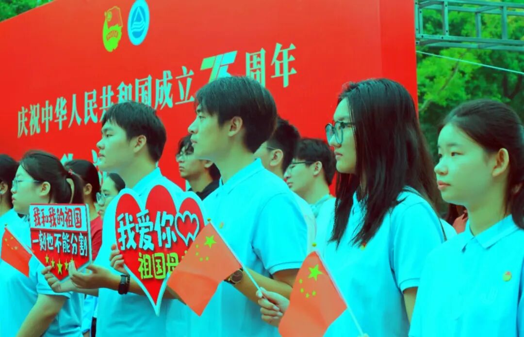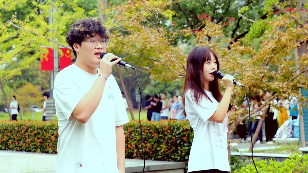 随后,校大学生艺术团吕茗敏和王郑旸同学演唱《红旗飘飘》。熟悉的旋律、深情的告白,师生们手中的国旗随着音乐旋律整齐划一地挥舞,现场成了红色的海洋。