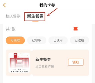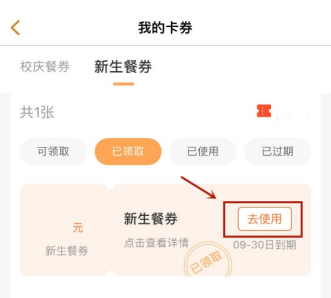 5、选择“新生餐券”,然后在“可领取”菜单下,点击”领取”(仅限2024新生,使用有效期至9月30日)。领取成功后,在“已领取”页面,点击“去使用”,就可以在学校食堂的卡机上进行扫码消费。