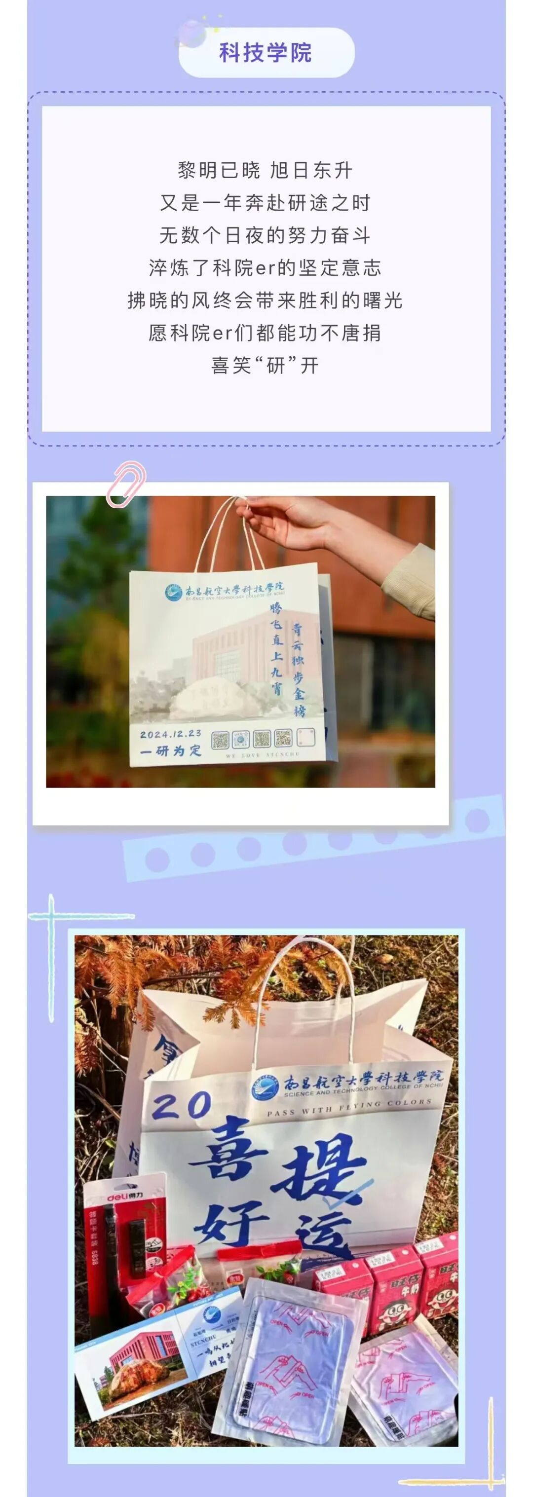 今年,我院共有近800名学生报名参加全国研究生招生考试。学院对考研工作高度重视,多次组织相关部门策划研讨,细化工作流程,强化措施落实,确保为考生们提供全面周到的考前服务。专题讲座、心理疏导、考研“福袋”、专车送考、爱心午餐……,无一不体现了学院对考生的深深关怀与祝福。