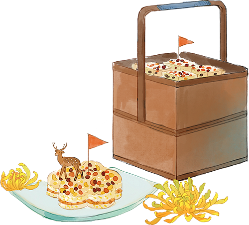 九月九日天明时,以片糕搭儿女头额,口中念念有词,祝愿子女百事俱高,乃古人九月作糕本意,当今的重阳糕仍无固定品种,各地在重阳节吃的松软糕类都称之为重阳糕。