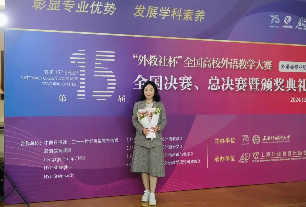 “外教社杯”全国高校外语教学大赛是我国最早举办的全国性外语类教学大赛之一,在国内外语教学领域颇具影响力。大赛连续5年纳入“全国普通高校教师教学发展指数”,助力高校教学相关能力与质量提升。本届全国总决赛形式为说课比赛。刘佳老师凭借多年的教学功底、独特的教学设计以及对教育技术的洞察理解,展现出了优秀的数智教育应用能力和临场应变能力,获得专家同行的高度认可,彰显了我校外语教学的深厚实力。