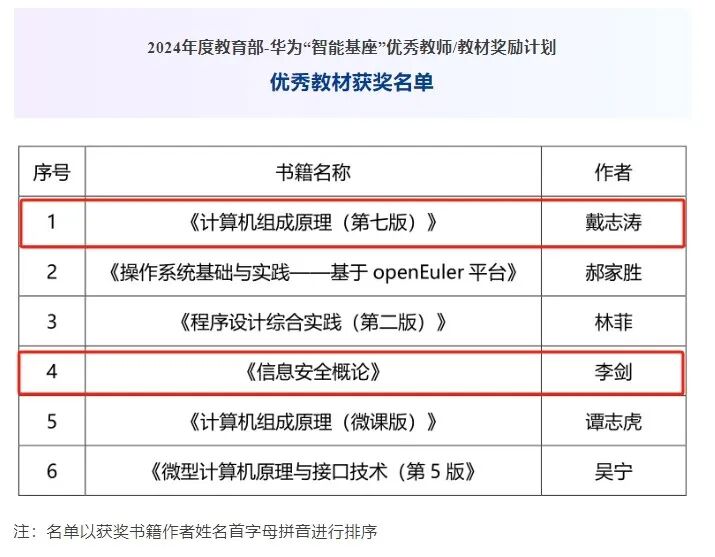 我校《计算机组成原理(第七版)》和《信息安全概论》获评2024年度教育部-华为“智能基座”优秀教材。