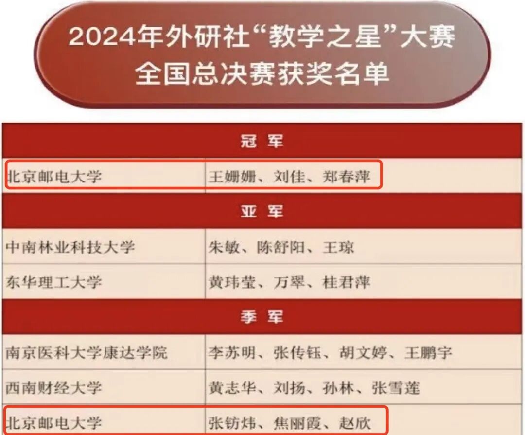 近日,2024年外研社“教学之星”大赛全国总决赛在北京举办,线上同步直播。19组参赛教师团队同台竞技,8万余位教师观摩交流,共探数智赋能外语教学有效路径,共享国际化人才培养创新思路。我校人文学院王姗姗、刘佳、郑春萍团队荣获全国总决赛冠军,张钫炜、焦丽霞、赵欣团队荣获全国总决赛季军。