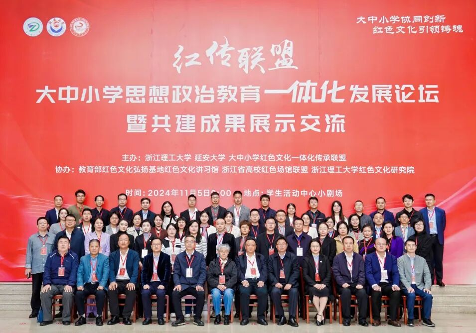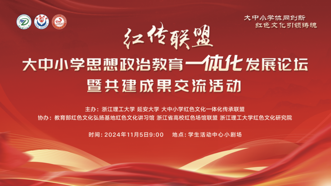 本次活动由浙江理工大学、延安大学联合大中小学红色文化一体化传承联盟主办,教育部红色文化弘扬基地红色文化讲习馆、浙江省高校红色场馆联盟、浙江理工大学红色文化研究院共同协办。论坛以“大中小学协同创新 红色文化引领铸魂”为主题,进一步探讨大中小学思想政治教育一体化建设,分享联盟共建的经验与成果。