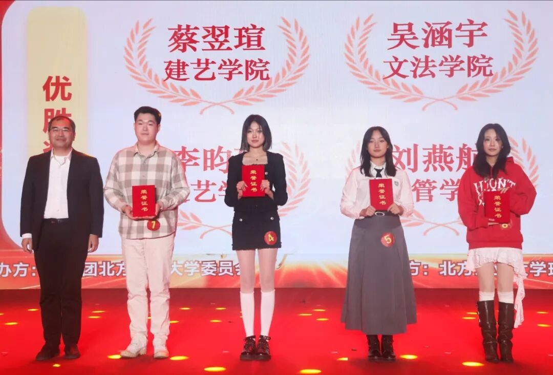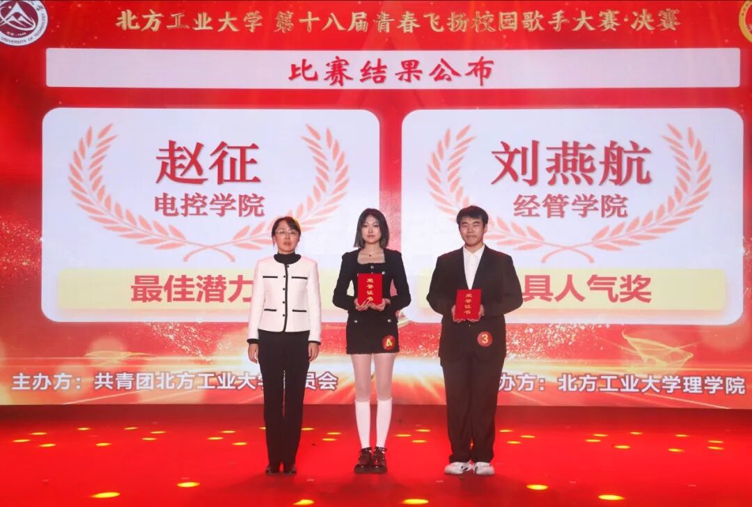 校团委书记杨超为最佳潜力奖获得者赵征、最具人气奖获得者刘燕航颁奖