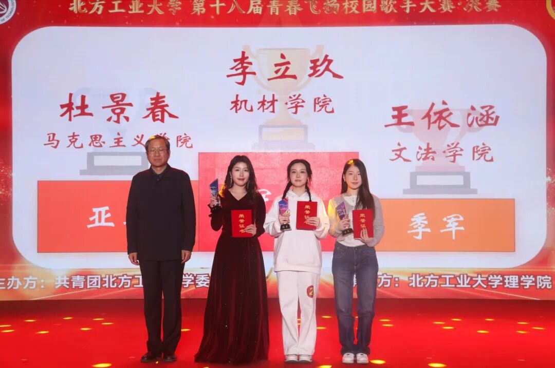 校党委副书记史贞军为获得比赛冠亚季军的李立玖,杜景春、王依涵3位同学颁奖