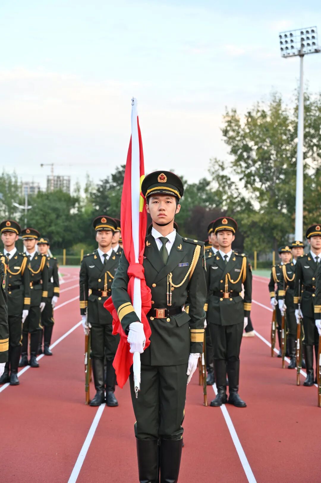 现场师生与国旗护卫队进行合影