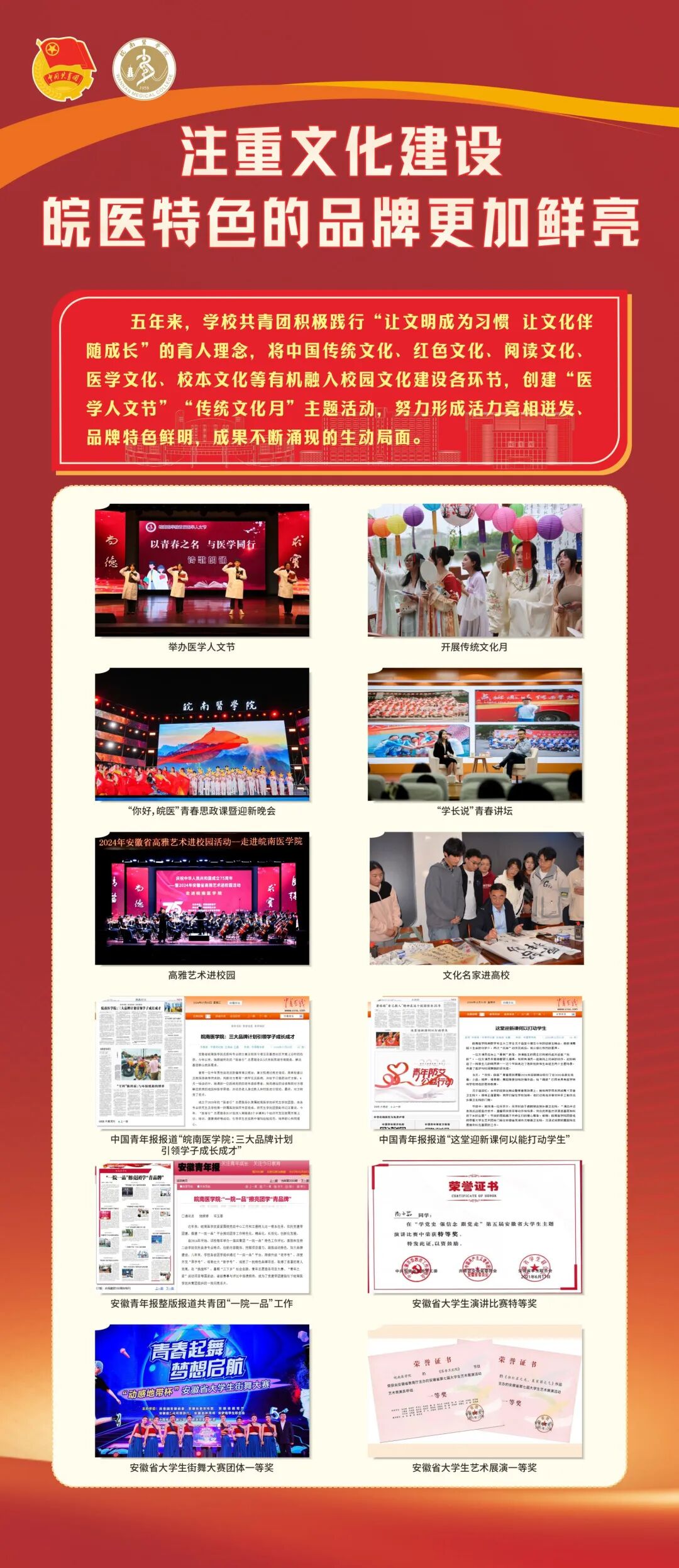 大会筹备工作领导组办公室在大会筹备期间,通过学校宣传栏举办“皖南医学院共青团五年工作巡礼”,从思想引领、校园文化、创新创业、社会实践、组织建设等方面向全校师生汇报我校团学工作取得的可喜成绩,并通过校团委微信公众号推出“一图读懂团代会”“一图读懂学代会”“历届团、学代会回顾”等系列专栏,在校园内营造了喜迎团、学代会的浓厚氛围。