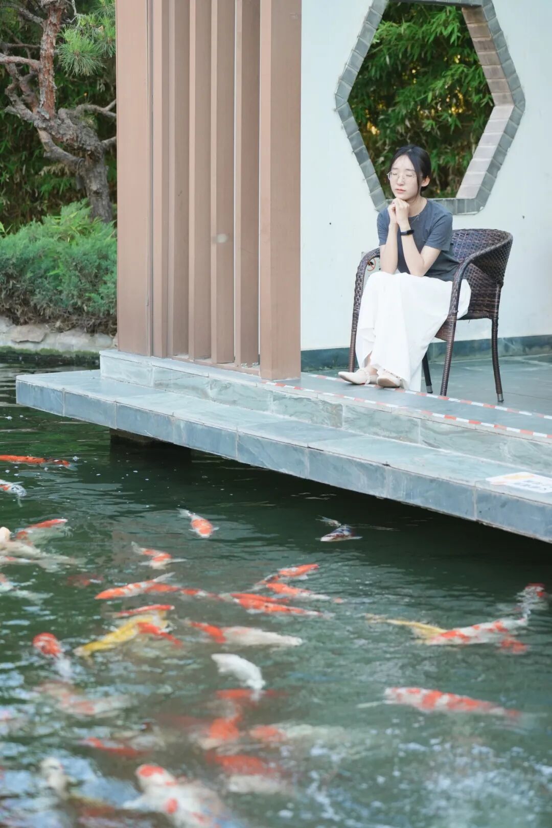 池中,一群群色彩斑斓的锦鲤悠然自得