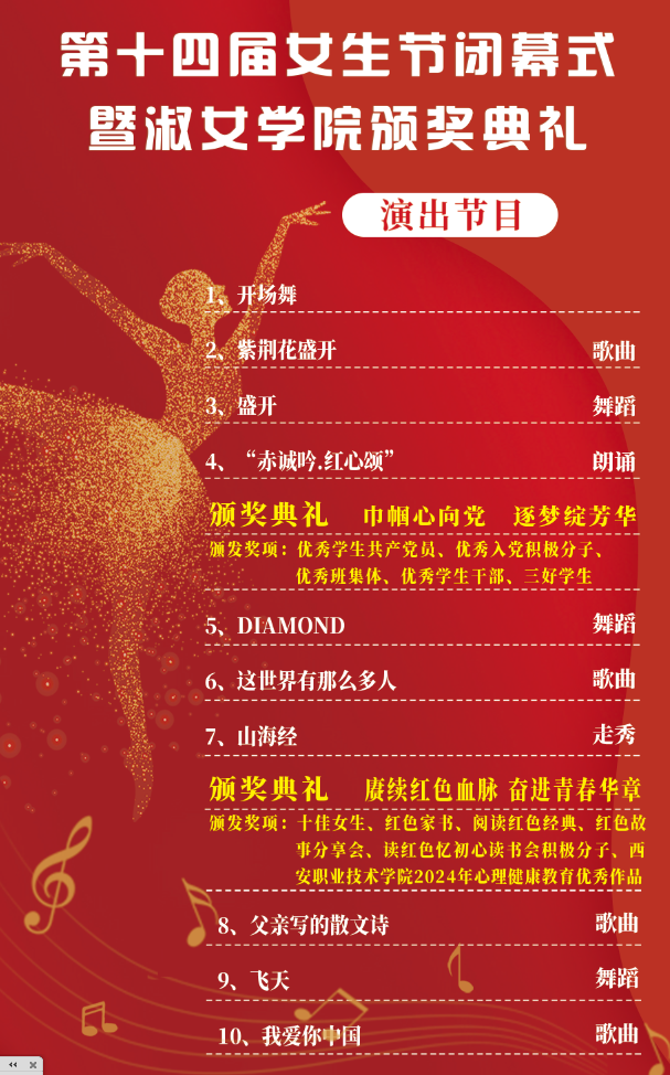 随着夜幕的降临,西安职业技术学院现代商学院淑女节闭幕式也缓缓落下了帷幕。但优雅与梦想的故事并未结束,它们将继续在每一位参与者的心中生根发芽,绽放出更加璀璨的光芒。此次淑女节不仅是一次关于美的盛宴,更是一次心灵的洗礼,它教会了我们如何在学业与生活中保持平衡,如何在快节奏的生活中寻找那份从容与优雅。让我们期待在未来的日子里,能够再次相聚,续写更多关于成长与蜕变的精彩篇章!