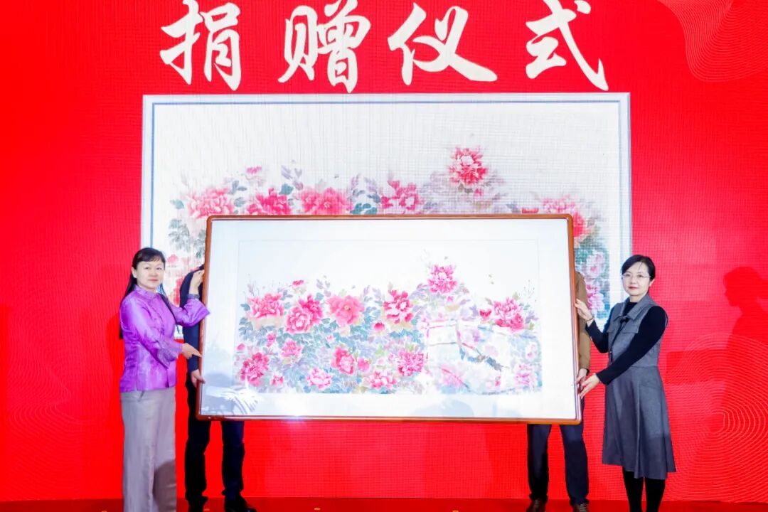 张莉代表参展艺术家邵亚芳向中国妇女儿童博物馆捐赠中国画作品《牡丹图二零二四》,中国妇女儿童博物馆副馆长李燕凌为艺术家颁发捐赠证书。