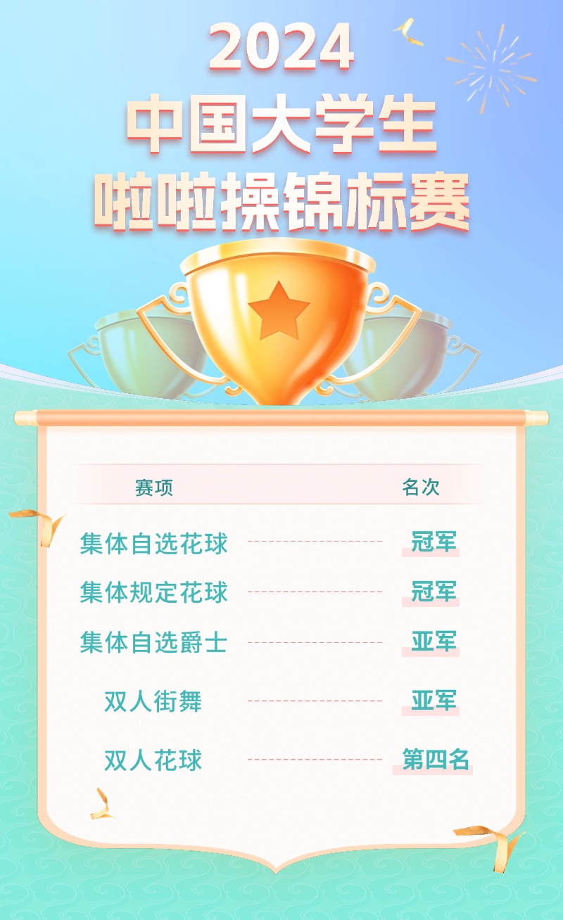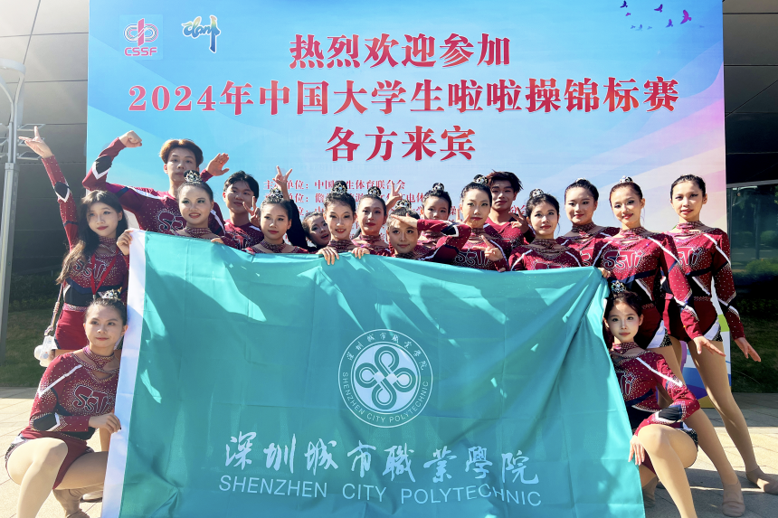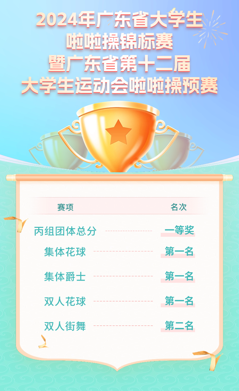 学校选派23名选手参与丙组(高职组)集体花球、集体爵士、双人花球、双人街舞4个项目的比赛,选手们凭借技术水平和高难度的动作表现,以团体总分第一的佳绩,成功晋级第十二届广东省大学生运动会啦啦操项目。