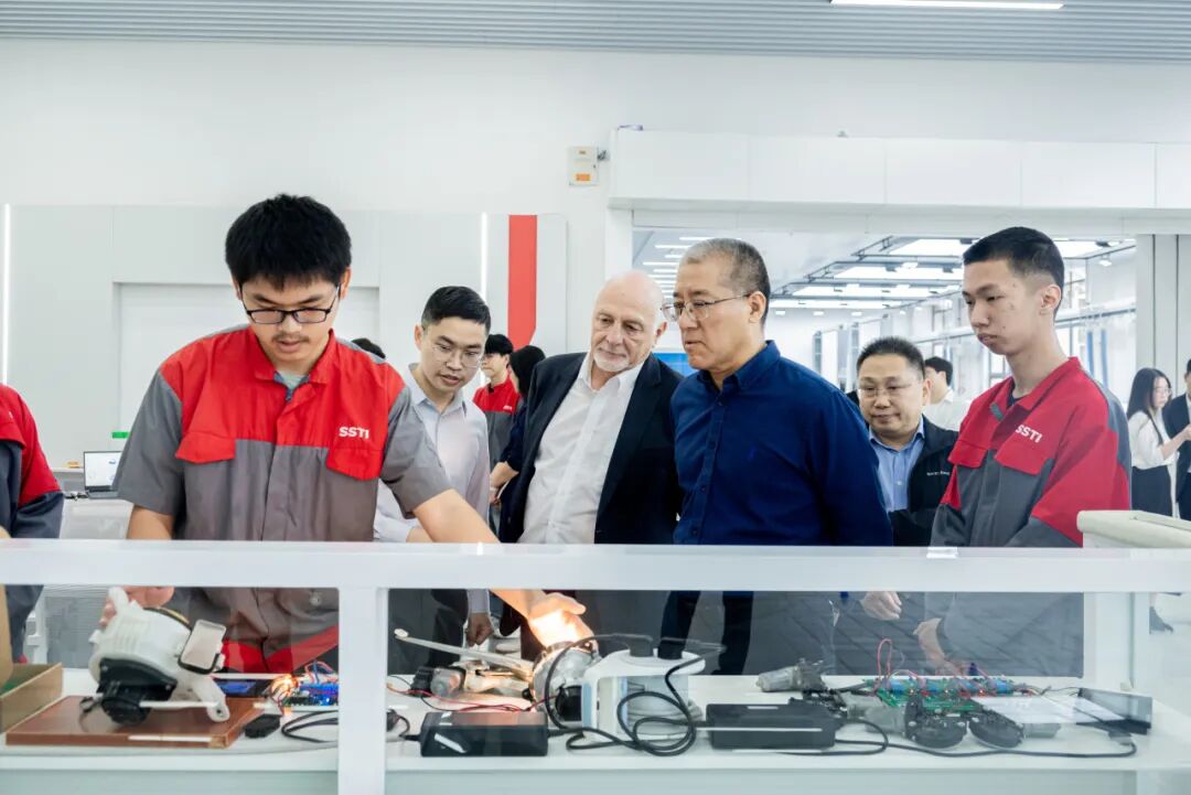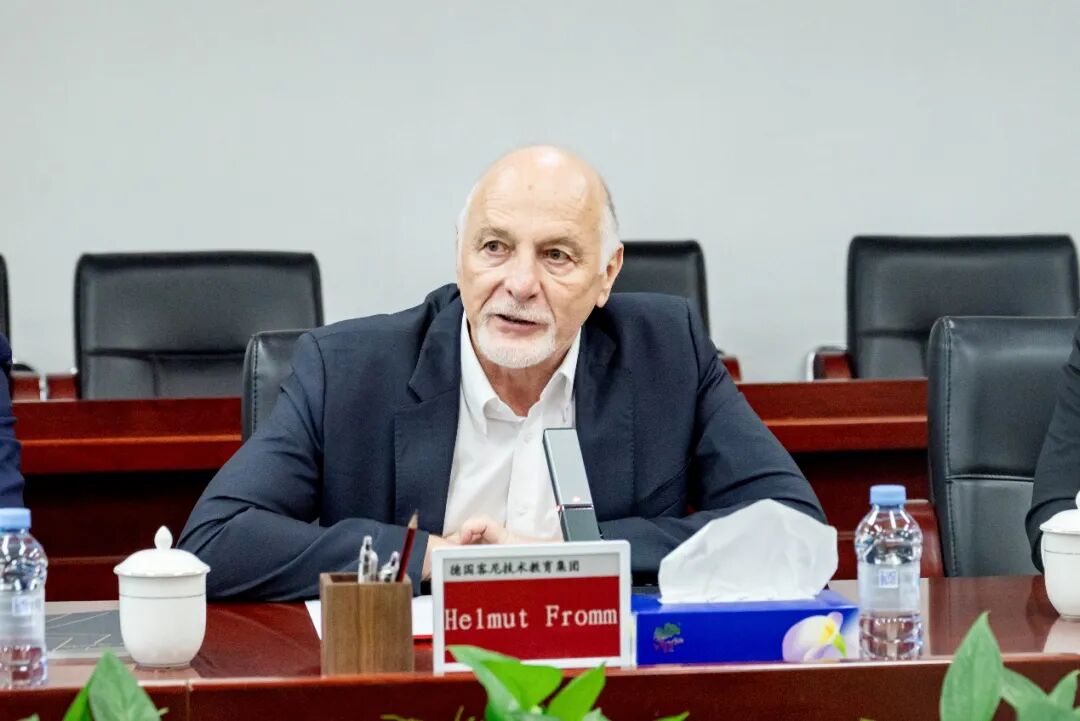 Helmut Fromm 先生对我校先进的教学设施和开放的教育理念给予高度评价。他特别强调,中德新能源汽车实训室不仅是一个教学和技能提升的场所,更是双方合作创新的结晶。通过引入德国标准和国际化设备,双方将携手培养兼具专业技能和创新能力的优秀人才,为全球新能源汽车产业输送更多高素质的技术技能人才。