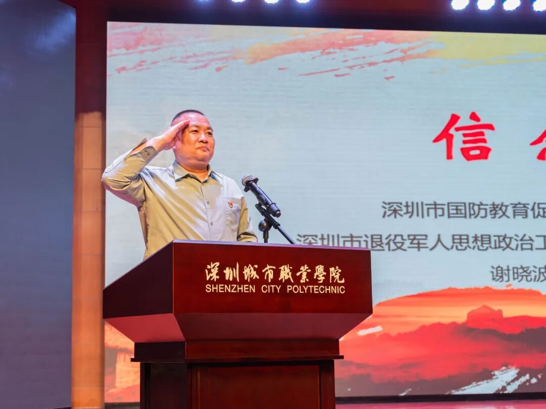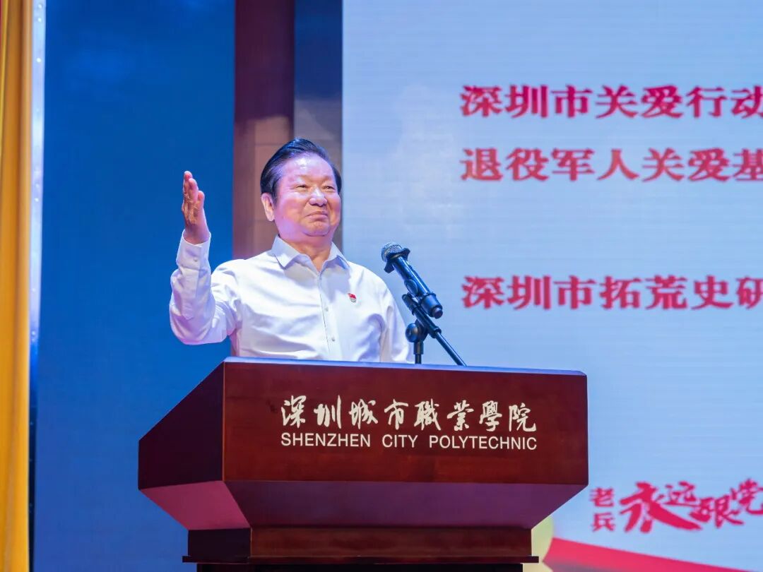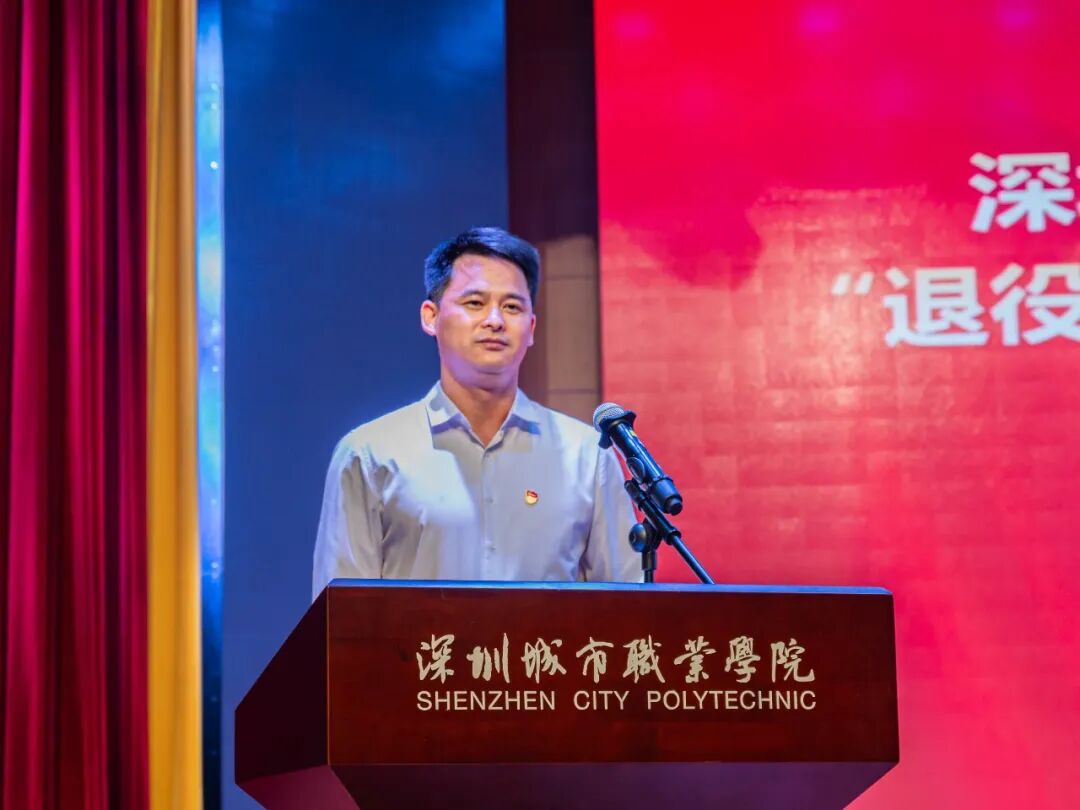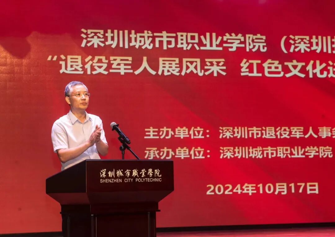 此次活动由深圳市退役军人事务局主办,深圳城市职业学院(深圳技师学院)承办。活动旨在贯彻落实习近平总书记重要指示精神和党中央决策部署,进一步发挥退役军人在传承红色基因和学校思想政治教育中的独特作用,把红色基因传承下去,确保红色江山后继有人、代代相传。本次活动也是学校“传承红色基因、学思践悟中国共产党人精神谱系”宣讲系列活动之一。深圳市委党史文献研究室二级调研员黄瑞栋,深圳市退役军人事务局思想权益处副处长谷君,深圳市关爱行动公益基金会秘书长陈美寿、副秘书长陈梅等领导出席活动。