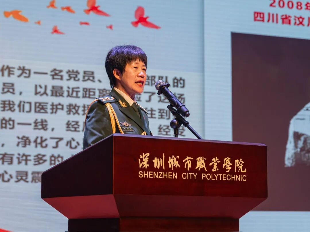 全国三八红旗手、全国公安系统抗震救灾先进个人获得者、一等功臣、深圳市军休干部红星义诊团团长陈伟红最后一个登台宣讲。她生动讲述了自己在部队的历练、成长以及面对的各种挑战。在讲述亲身经历的“5.12汶川地震”抗震救灾工作细节时,她几度哽咽,也让在场师生深受感动。