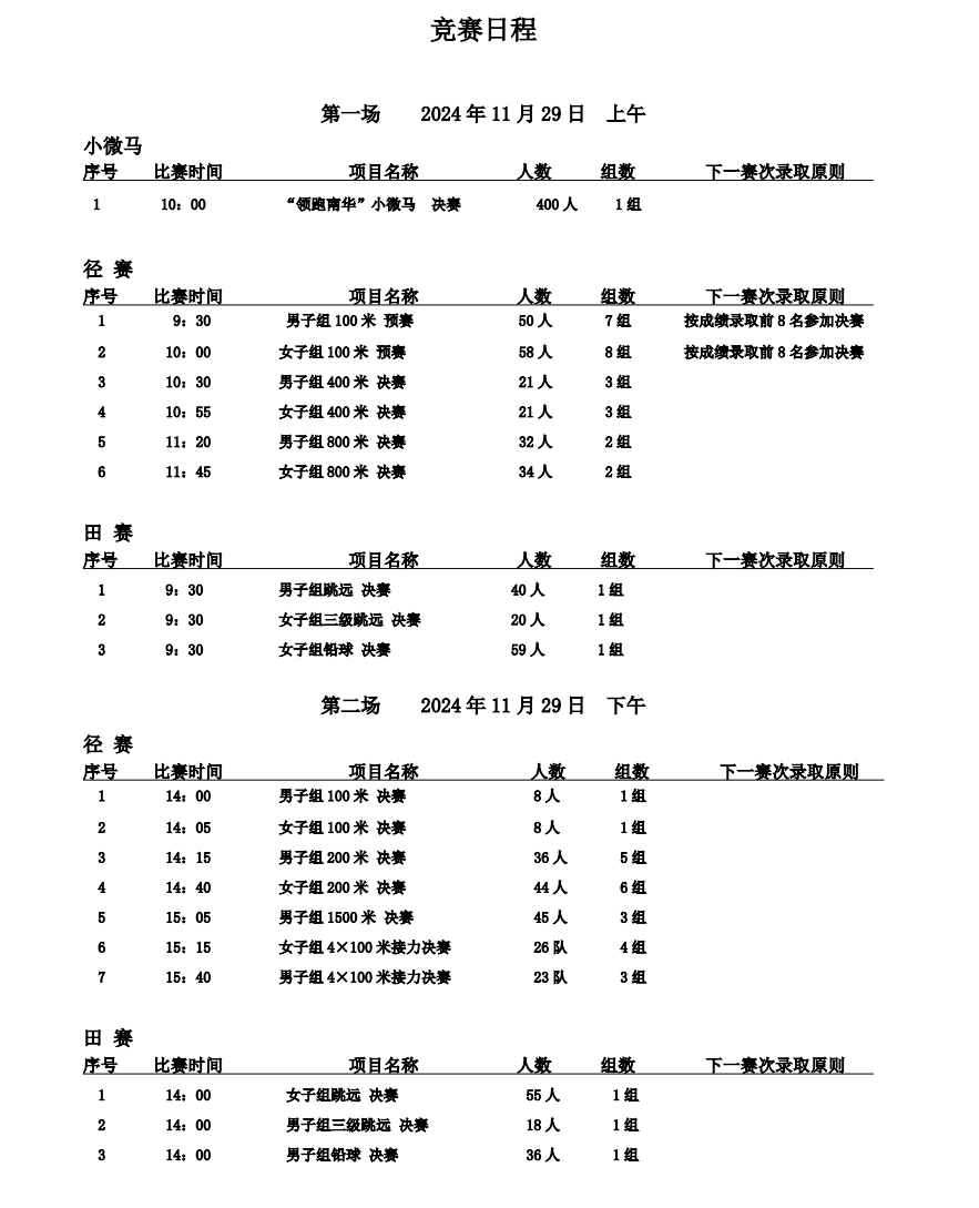 100 米、200 米、400 米、800 米、1500 米、跳远、三级跳远、铅球、4×100 米接力