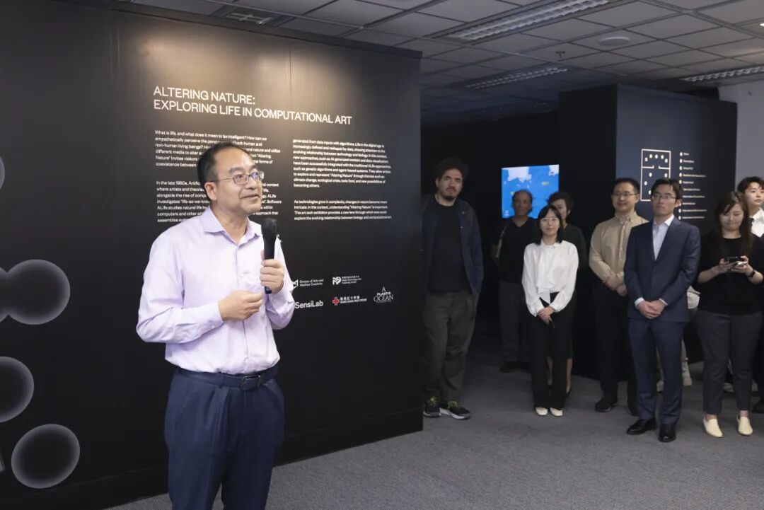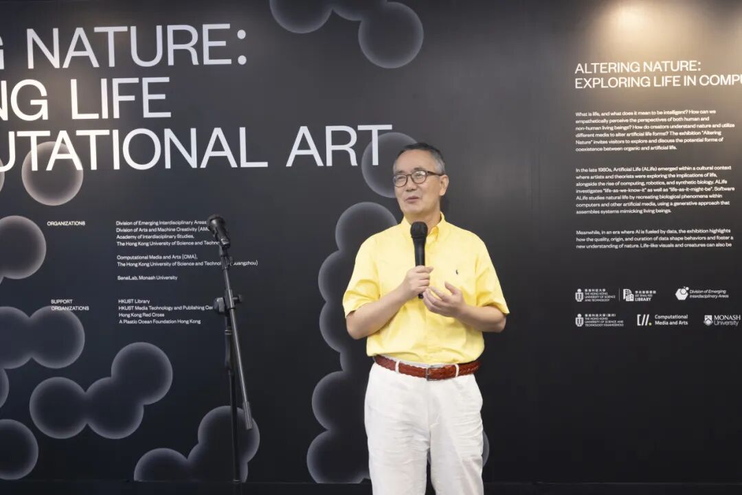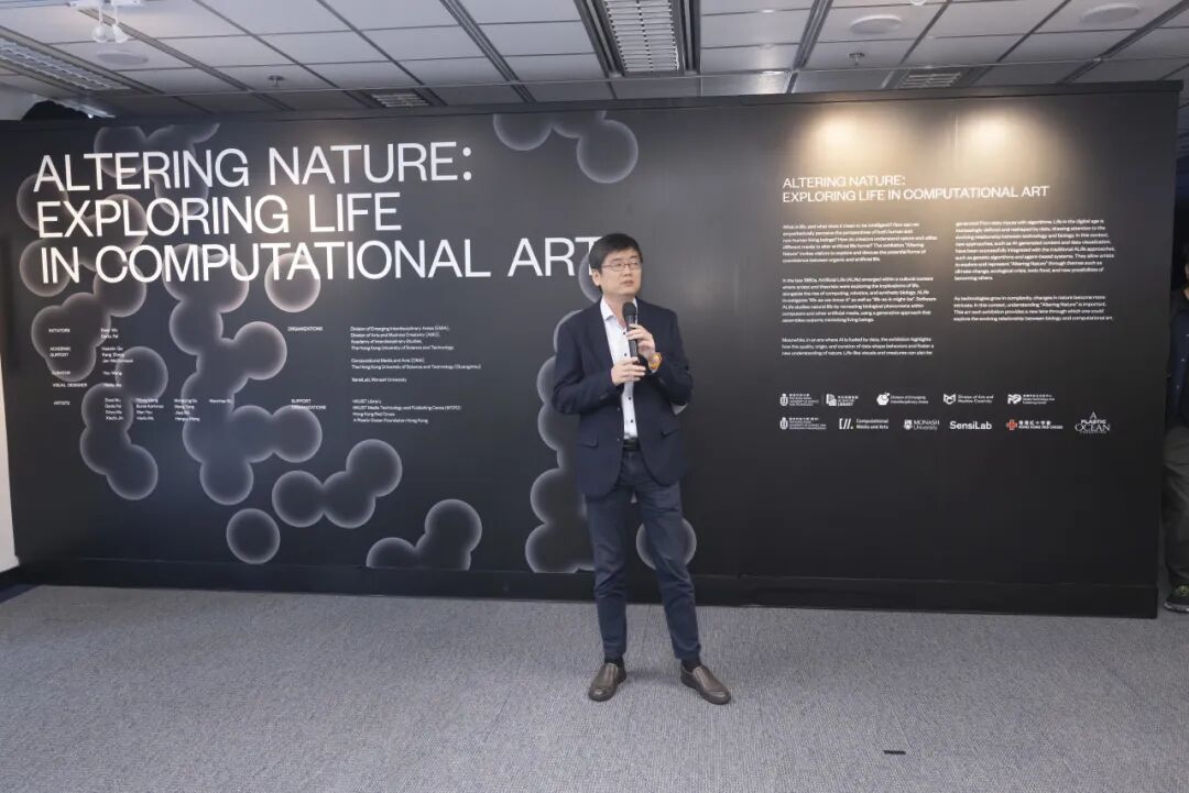 作为新成立的港科大艺术与机器创造力(AMC)学部的署理主任,傅红波教授介绍了该学部的使命,并阐述了其与展览主题的契合。他探讨了有机生命与人工生命共存的可能性,特别是通过机器辅助艺术实践与批判性研究的角度。傅教授指出,此次展览探讨涉及了许多重要的问题,例如生命的本质及人工生命的定义,尤其是在人工智能时代的背景下,如何运用机器的创造力创作新的艺术作品。他感谢了来自包括莫纳什大学在内的各方校外其他科研合作伙伴的贡献,并强调了通过跨学科合作使研究者向艺术家的角色转变的可能性。最后他祝愿大家尽情享受这场展览带来的精彩体验。
