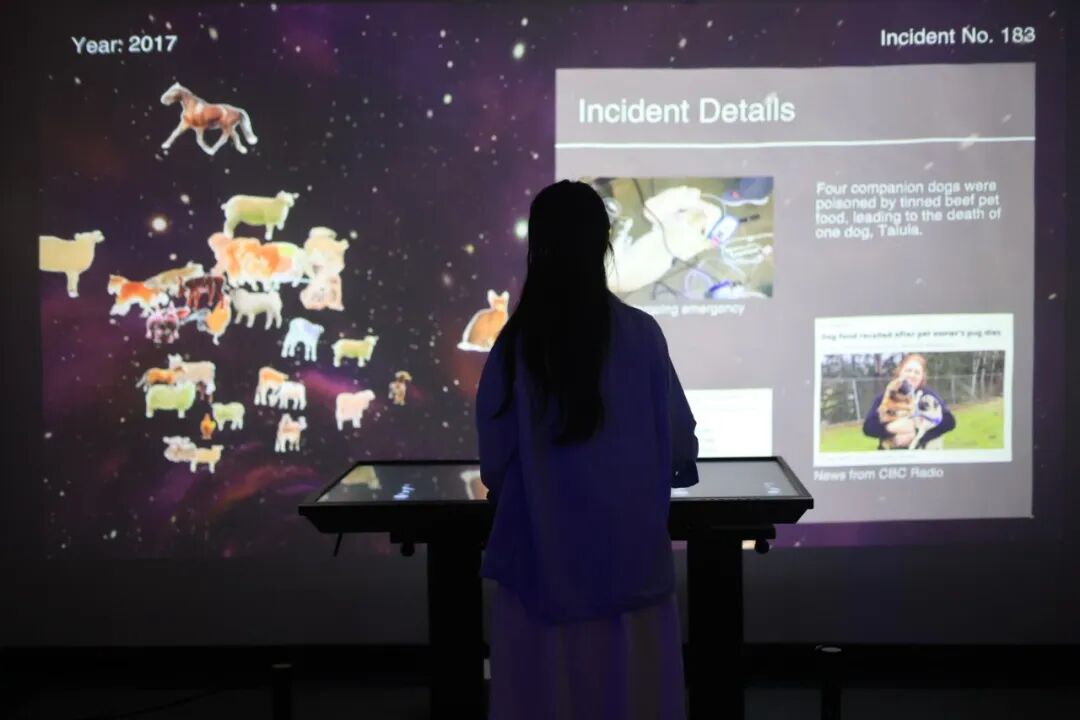 《宠物食品的隐秘事件》是一个系列作品,结合了人工智能、数据可视化和档案研究,揭示了在资本主义影响下人类与宠物之间复杂且商业化的关系。该艺术作品聚焦于宠物食品,这种商品代表了人类对宠物的情感,在服务导向市场经济中的重要角色。项目探讨了三种影响宠物和人类健康的物质:牛磺酸、三聚氰胺和戊巴比妥。