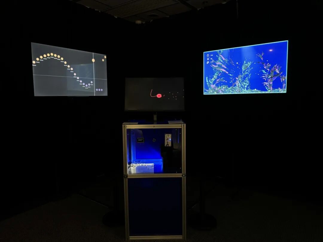 《利益游戏:外来海藻群》是一个多屏幕的人工生命艺术游戏装置。作品灵感来源于宽叶海藻, 一种可以作为食物和护肤品的原材料,多年来一直被人类在全球进行广泛的种植,来获取食物和金钱。然而环境变化容易引发海藻形态的变异。人们盲目追逐利益却可能背道而驰,涸泽而渔反而会导致环境退化和海藻种群的衰退。