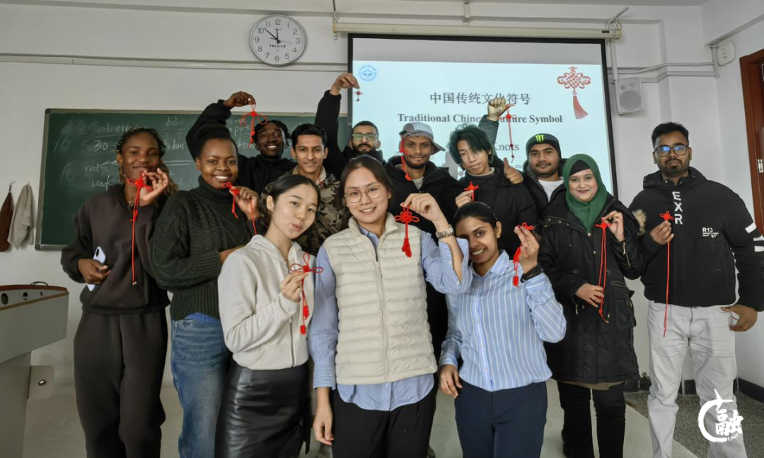 International students at the inaugural International Master's Program in Aviation Transport Management at the Civil Aviation University of China join a Chinese cultural symbol program on Dec 15, 2023. [Photo provided to chinadaily.com.cn]