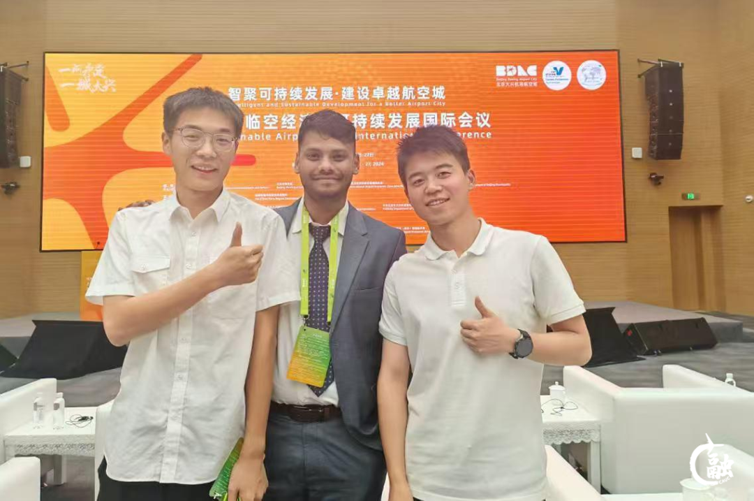 An international student and two Chinese students attend a conference on the sustainable development of the aerotropolis economy in Beijing on Sept 25. [Photo provided to chinadaily.com.cn]