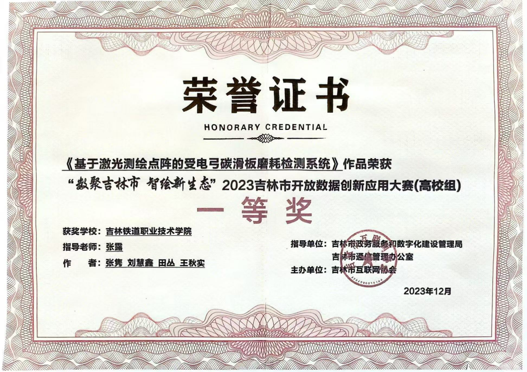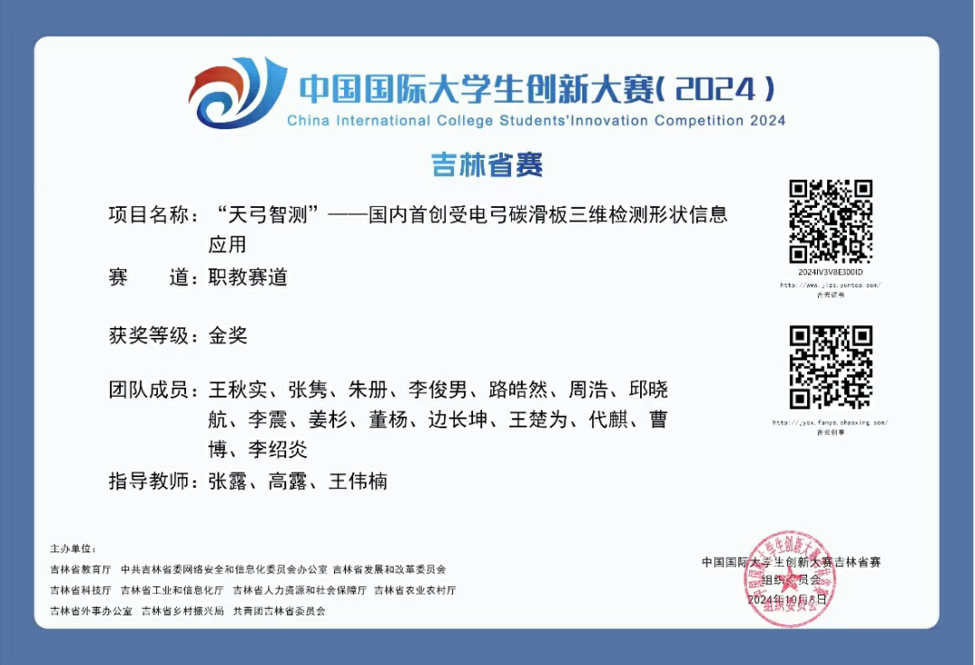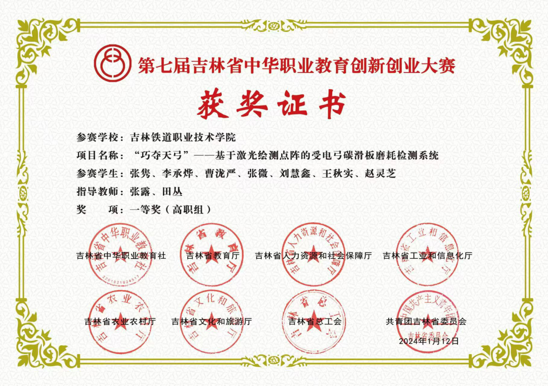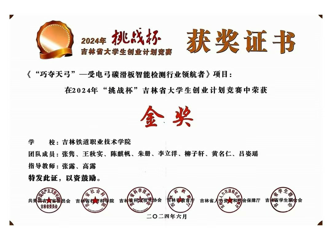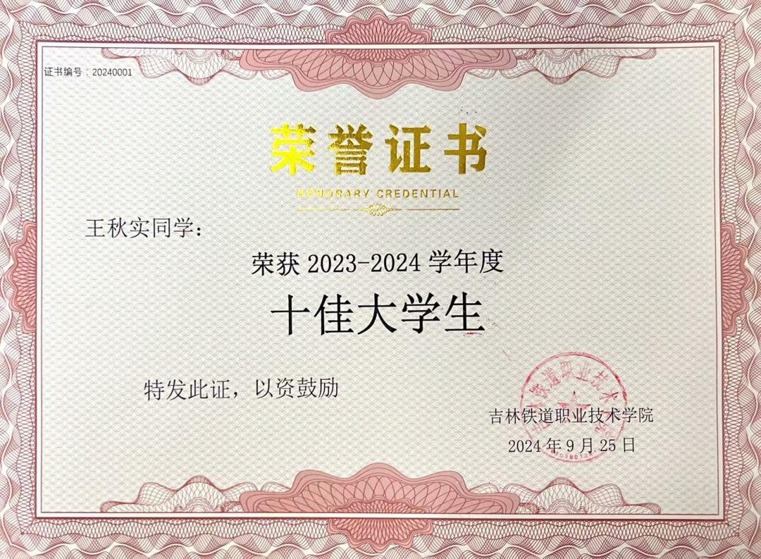 王秋实,男,中共预备党员,平均绩点3.39,平均学分绩87.58,综合素质排名1/92。东北亚高铁学院动车组检修技术专业2202班班长、曾任东北亚高铁学院心理部部长。曾荣获“十佳大学生”、“优秀学生干部”、“军训标兵”、“优秀志愿者”、“优秀团员”等荣誉称号,并多次获得各类奖学金。大学期间积极参加各类大学生比赛,并获得“第十四届‘挑战杯’吉林省大学生创业计划竞赛金奖”、“第七届吉林省中华职业创新创业大赛一等奖”、“2023吉林市开放数据创新应用大赛一等奖”、“中国国际大学生创新大赛(2024)吉林省赛金奖 ”、“2024年‘达盛杯’吉林省大学生电子设计竞赛二等奖”、“2023年‘达盛杯’吉林省大学生电子设计竞赛二等奖”、“吉林省大学生乡村振兴创新创业大赛二等奖”、“2024年‘创青春’吉林省青年创新创业大赛铜奖”等荣誉。