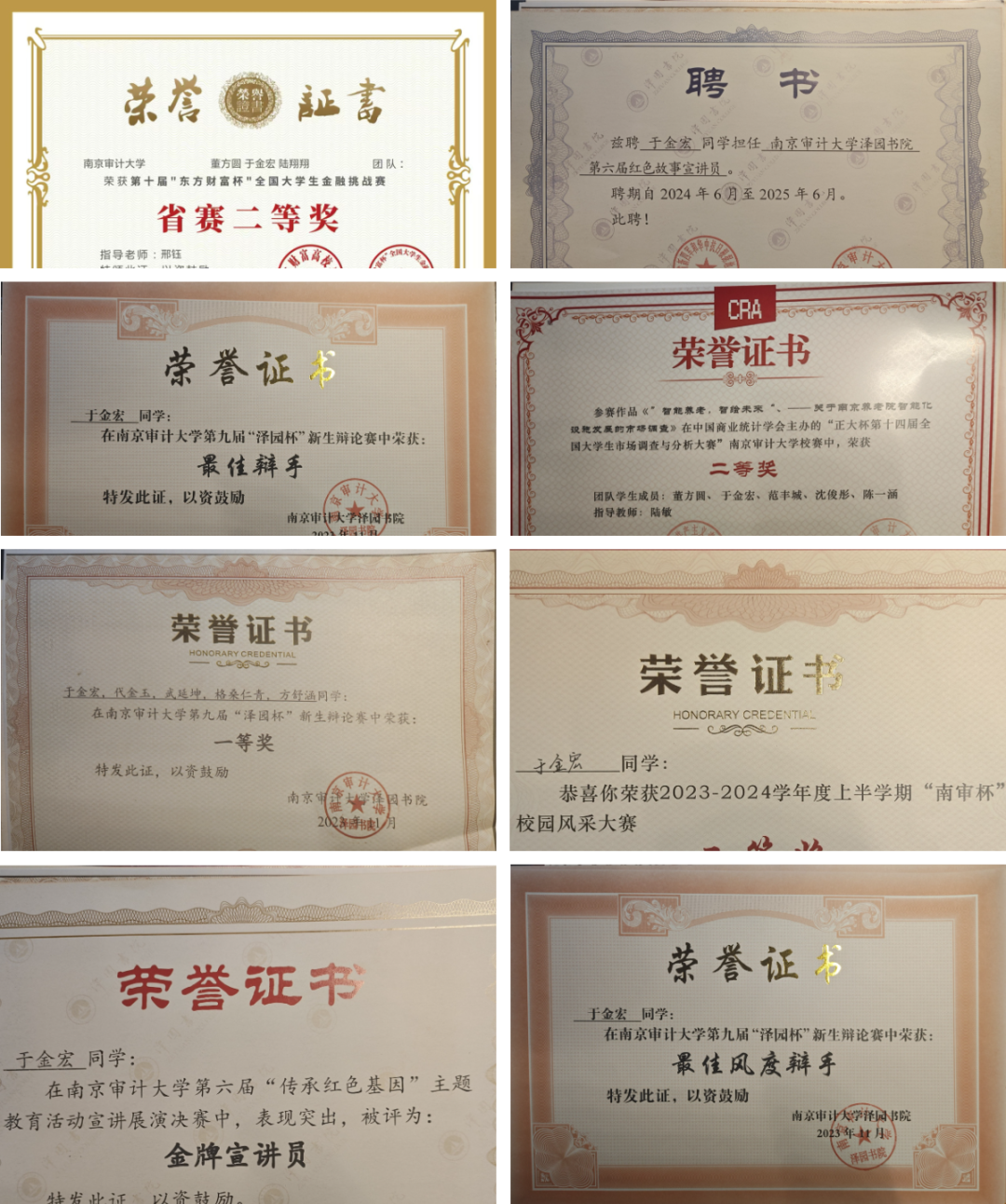 于金宏在2023学年中斩获无数校级、省级赛事一、二等奖,