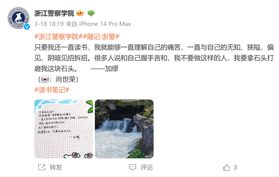 运维数据部主要负责分析研判网络热点信息及其发展趋势、根据后台数据为各平台账号未来发展方向提供建议,并负责运营我校的知乎官方账号以及浙警院官方微博账号。