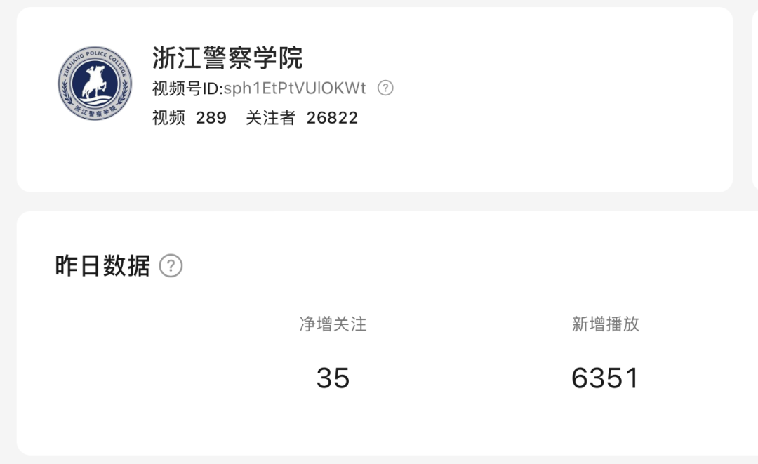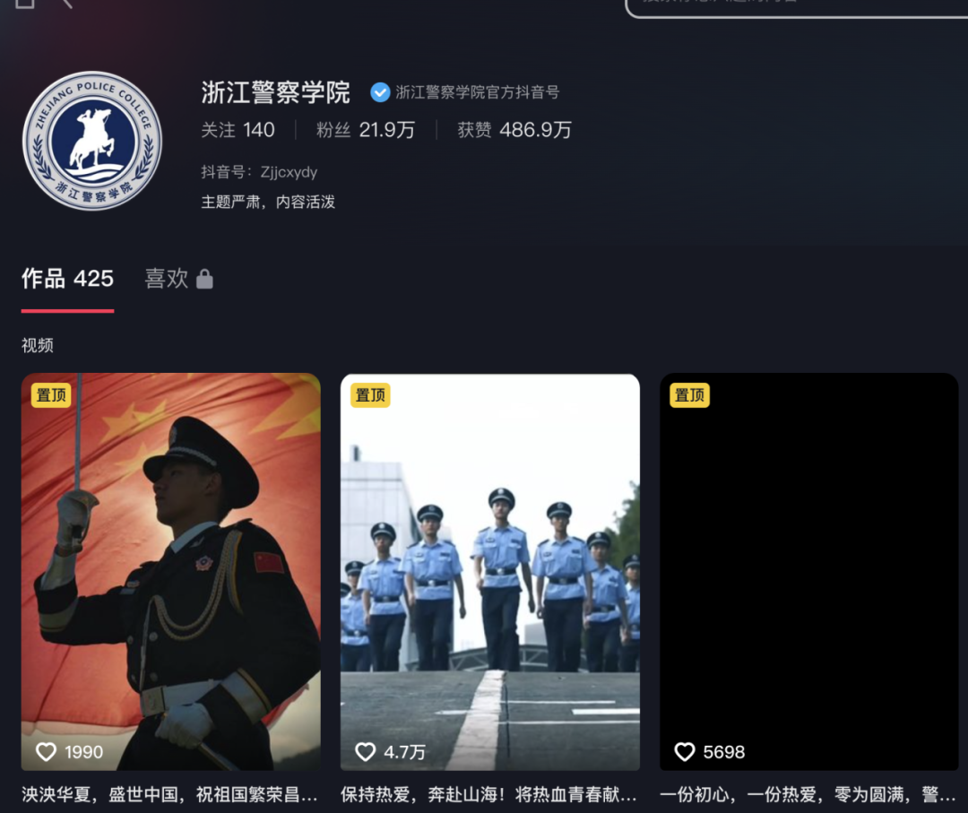 融媒体中心影视部主要经营浙江警察学院官方三大平台:抖音、微信视频号、B站。抖音平台目前已经拥有粉丝近22W,获赞486.6w。