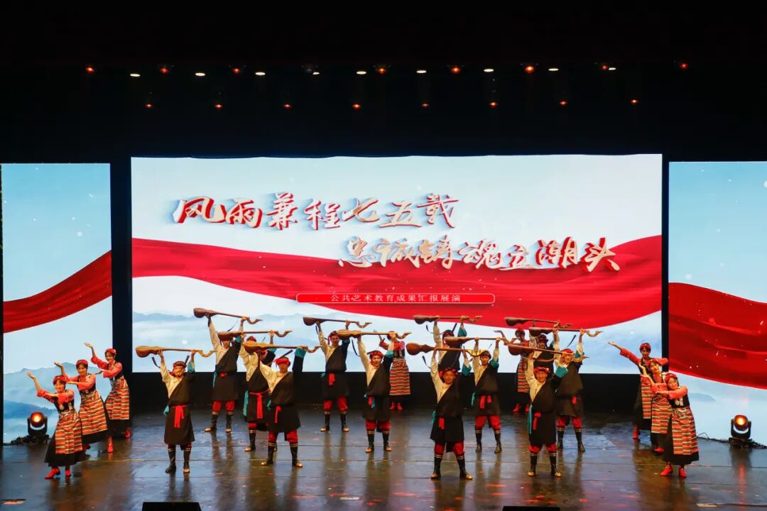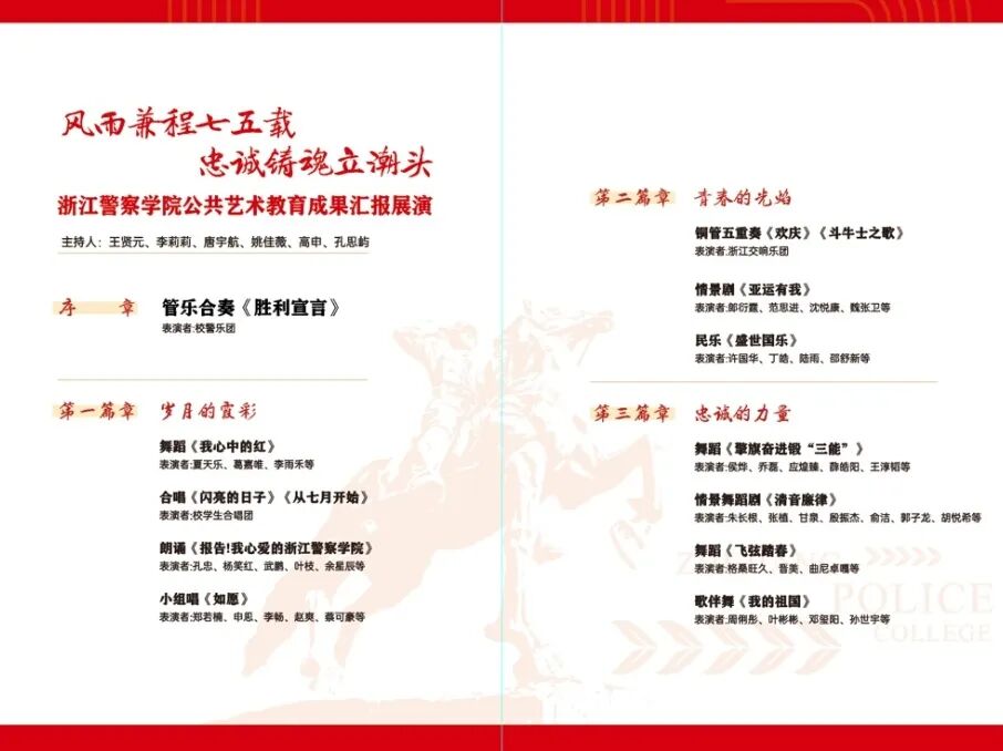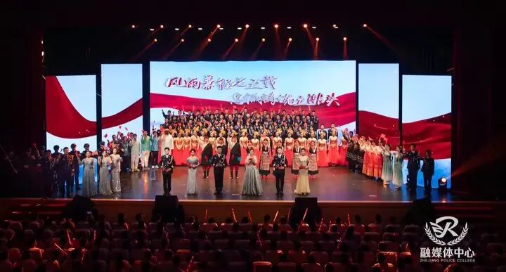 10月25日晚上,公共艺术教育成果汇报展演在滨江校区文化活动中心举行。在家校领导,全国公安院校领导,校企局合作单位代表,校友代表,学校师生代表共900余人观看演出。展演以“风雨兼程七五载,忠诚铸魂立潮头”为主题,分为“岁月的霞彩”“青春的光焰”“忠诚的力量”三大篇章,展现了学校师生与党和国家同向前行、接续奋斗,在追梦路上挺膺担当的奋斗历程。