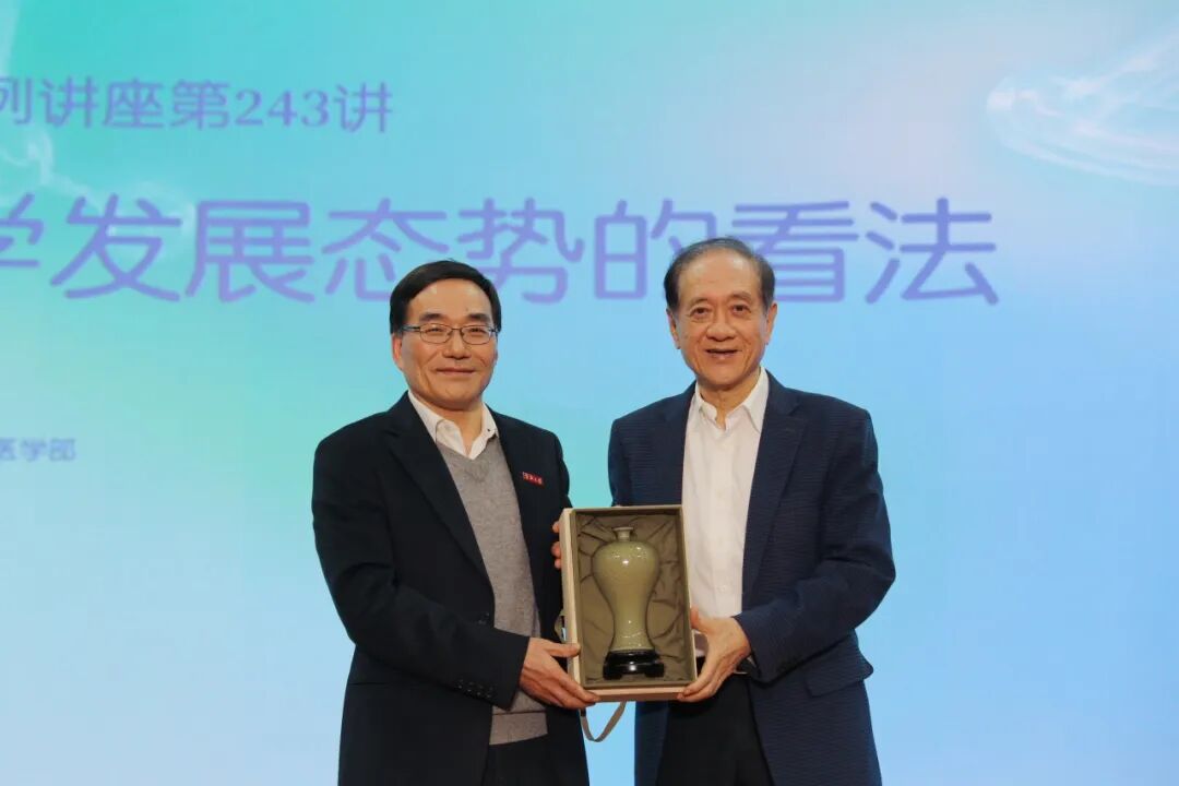 蔡荣根校长向韩启德院士赠送了象征宁波文化底蕴的“古越青瓷”纪念品,寓意此次讲座如同古越青瓷一般,字字温润,意蕴深远,值得永远珍藏!