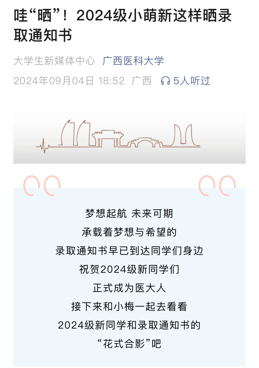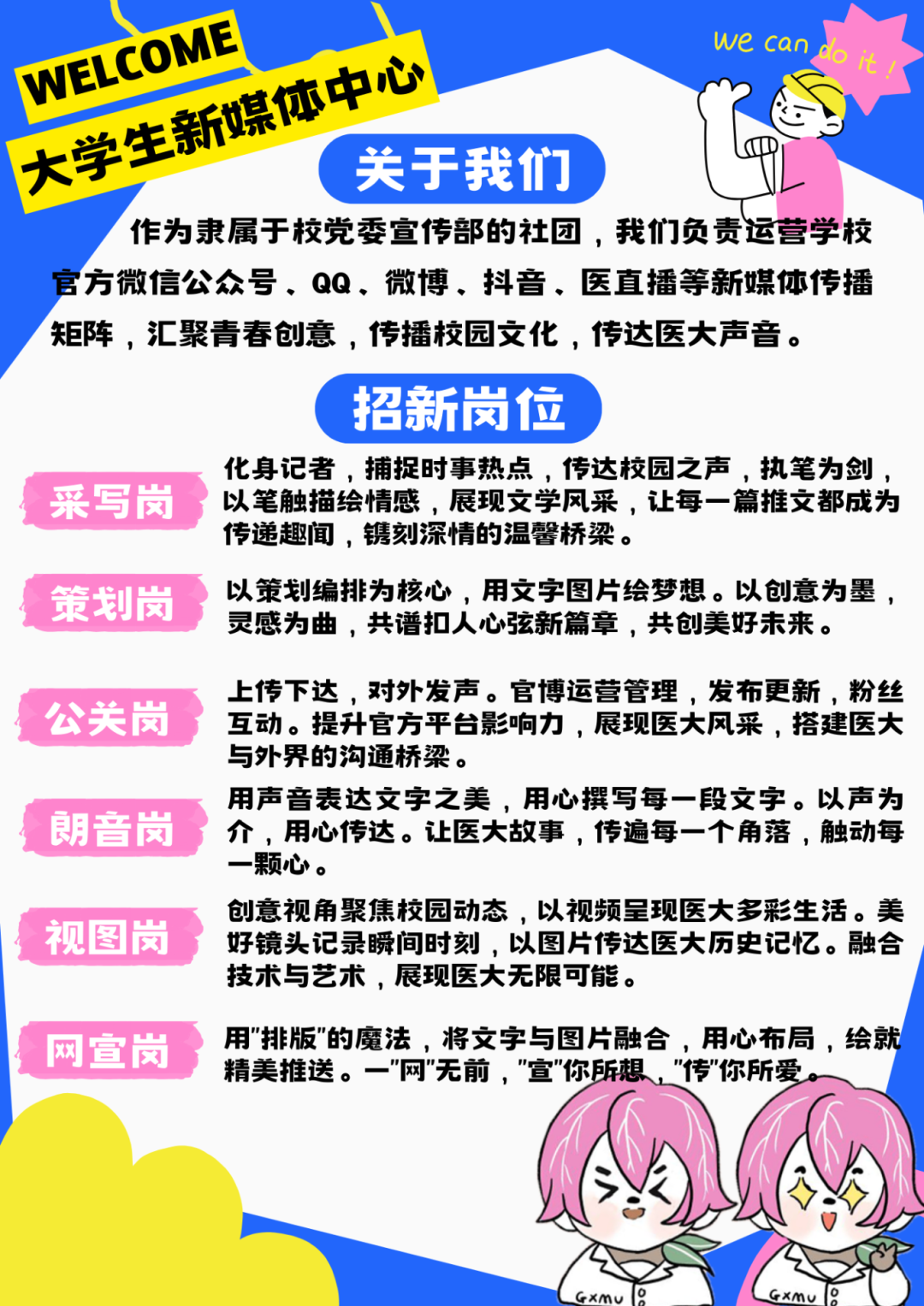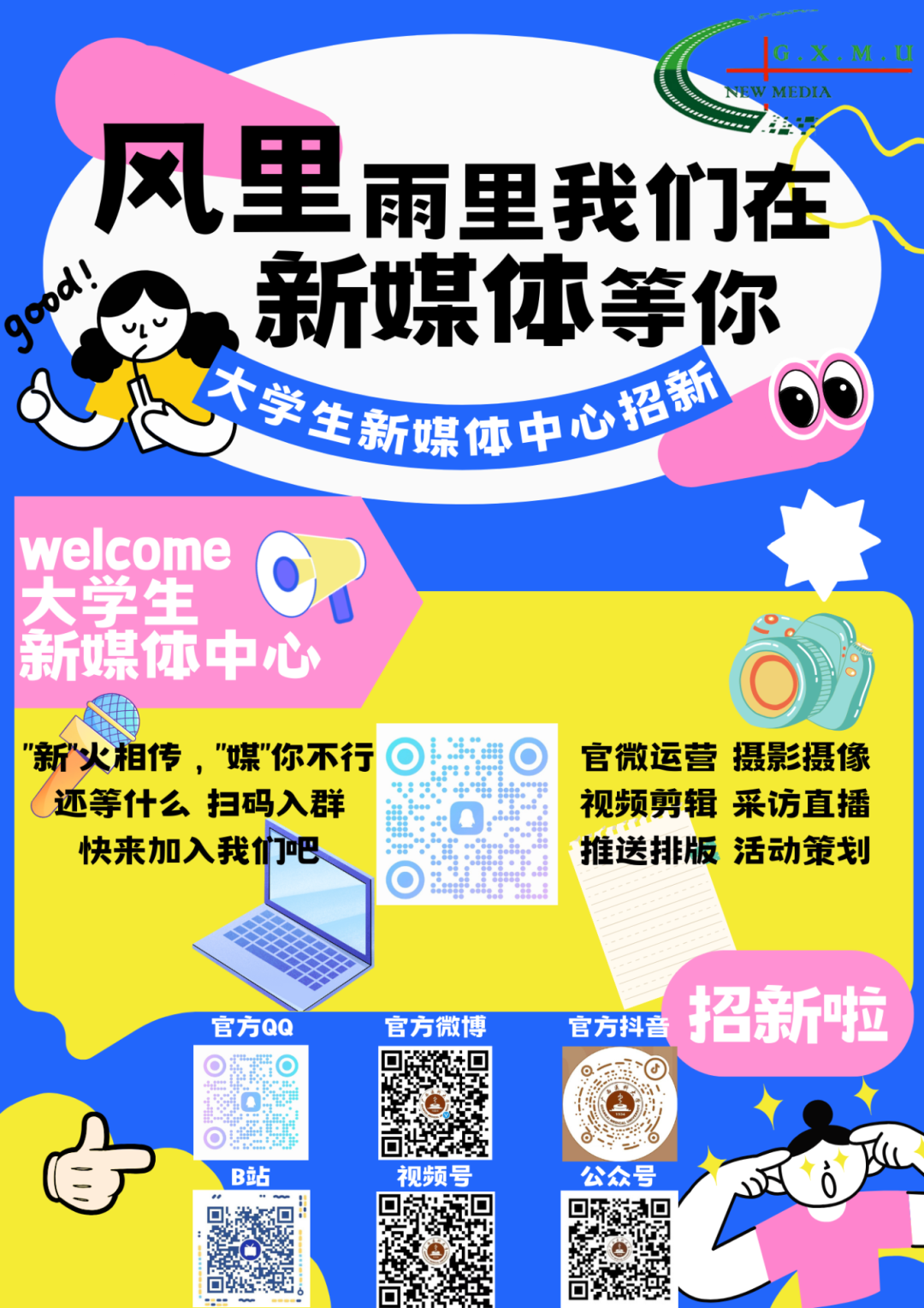 广西医科大学大学生新媒体中心(以下简称新媒体中心)隶属于校党委宣传部,主要负责广西医科大学官方微信公众号、QQ、微博、抖音、医直播以及Bilibili等校级媒体矩阵的运营管理。